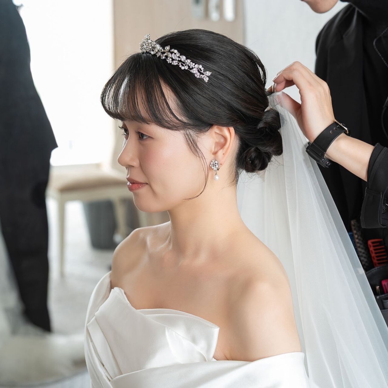 ウェディングドレスの時は上品なパールがついたイヤリングをつけて、カラードレスでは動きのあるイヤリングにチェンジしています。