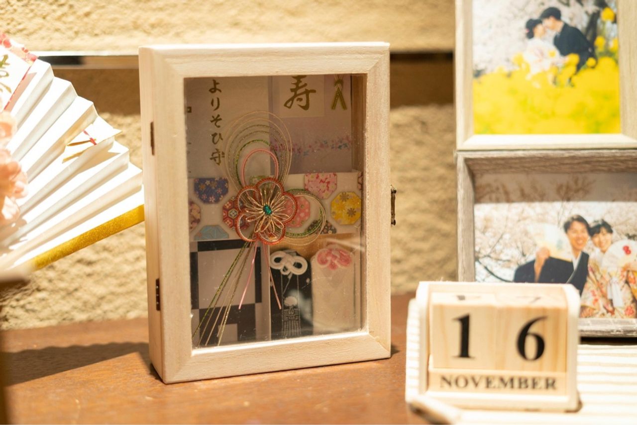 ウェルカムスペースには前撮りで使ったDIYの扇子やよりそい守り、前撮り写真などを置きました。