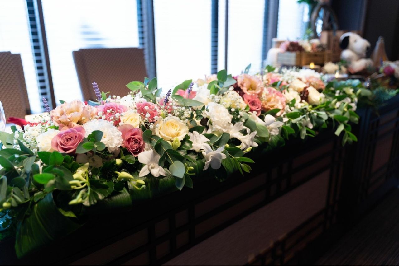 スモーキーカラーの造花を使用しました。高砂の装花は少しボリュームを抑えたので、どんなふうになるかドキドキでした。でも当日見てみるとイメージ以上の出来栄えで嬉しかったです。