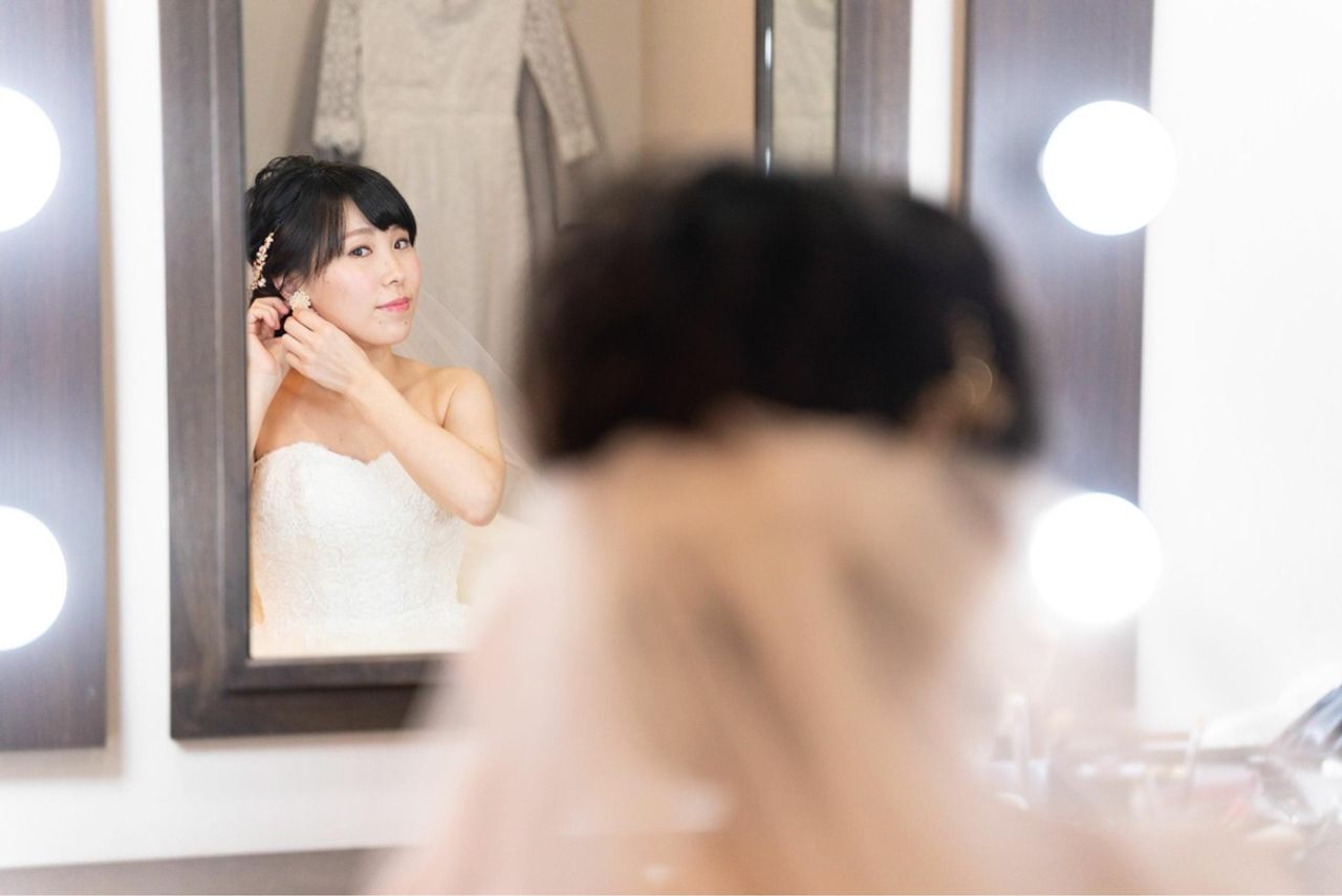 ウェディングドレスではバックに、カラードレスではサイドに場所を変えてつけました。