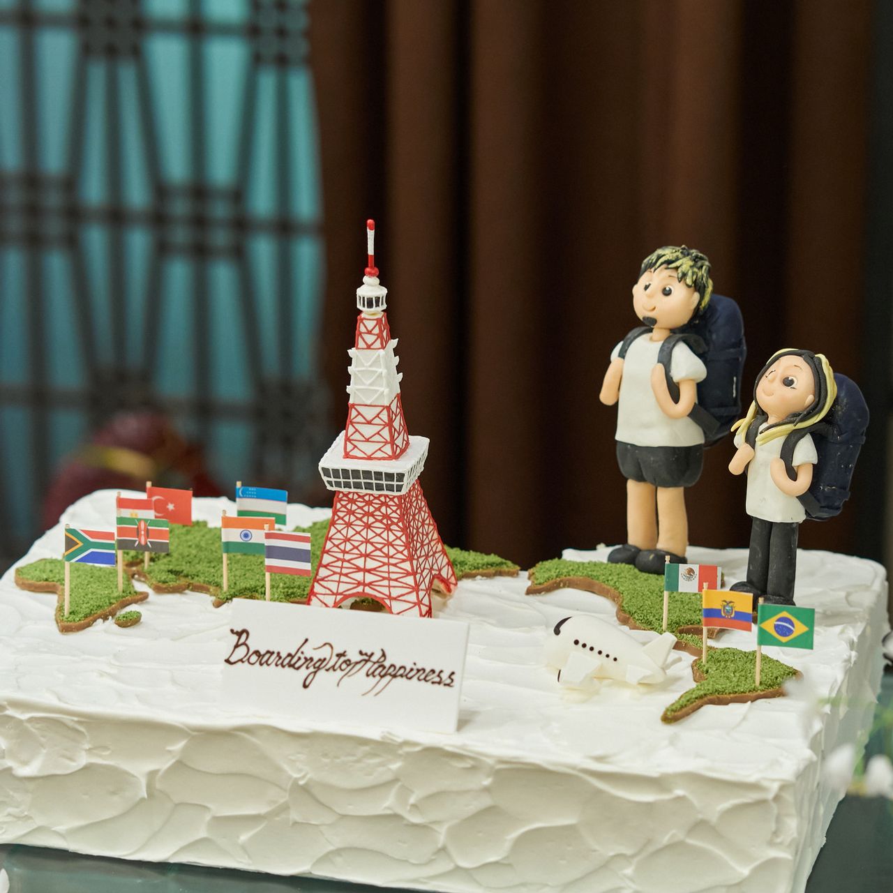 ウェディングケーキは、「世界一周」をテーマに、細部までこだわって作っていただきました。