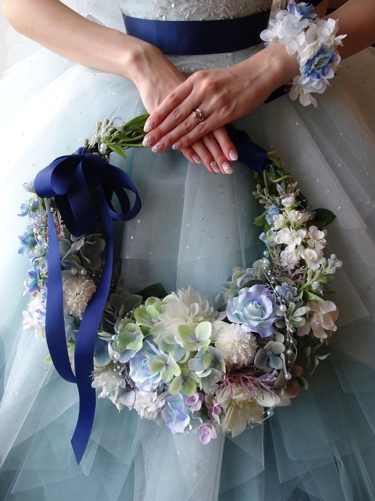 カラードレスは、ダウンスタイルで、シルバーアクセサリー、ブルー系フラワー、パールとたくさん付けました。