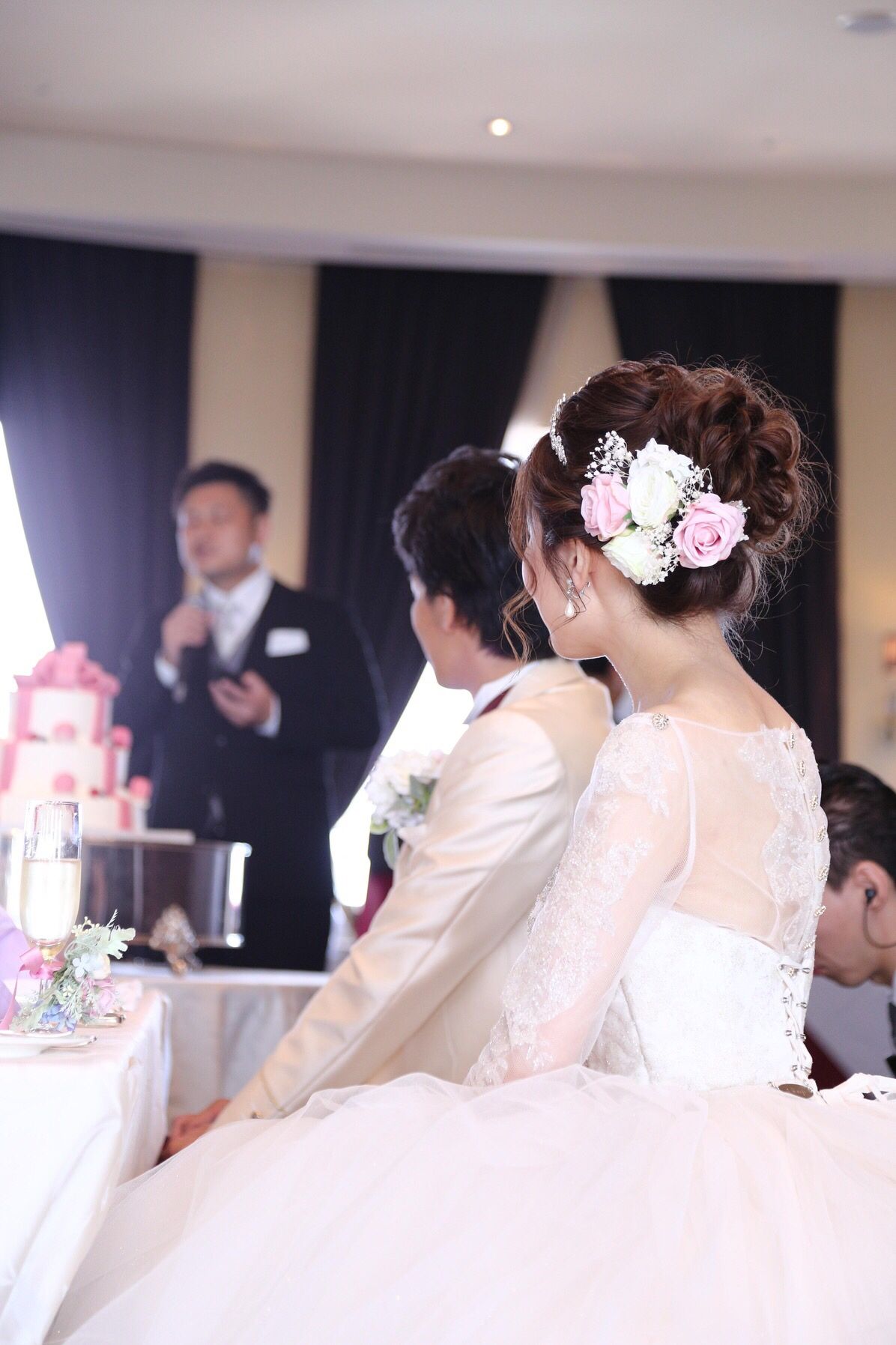 披露宴のウェディングドレスでは、アップスタイルで、ティアラとお花を付けました。