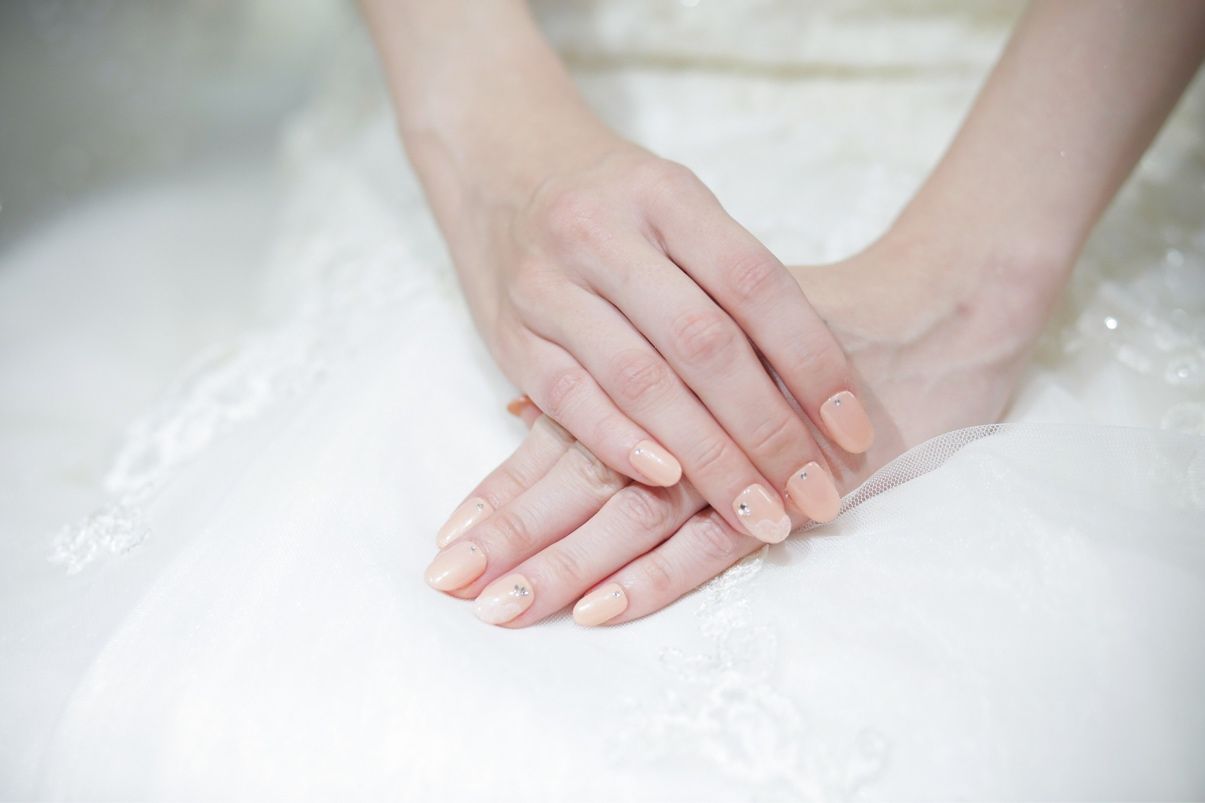 普段は仕事柄ネイルができないので、チップを作ってもらいました。ピンクをベースにストーンを1つずつ置いてもらいました。ネイリストさんに「指輪交換で指を間違えないように、左手の薬指だけ少し変える方もおられますよ」と言われたので、左手の薬指だけレースを少し入れてもらいました。
