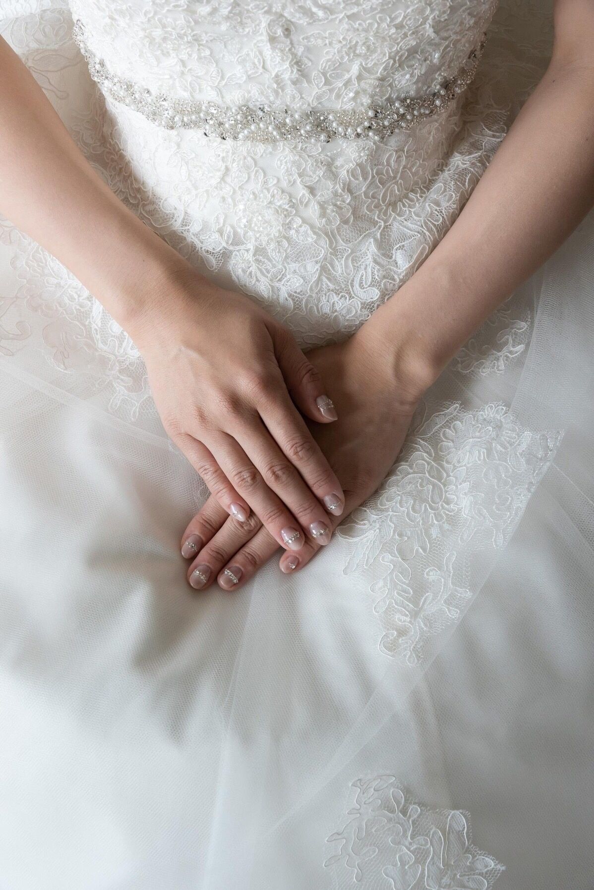 ドレスに合わせて、ビジューのラインが入ったキラキラした、デザインのネイルです。