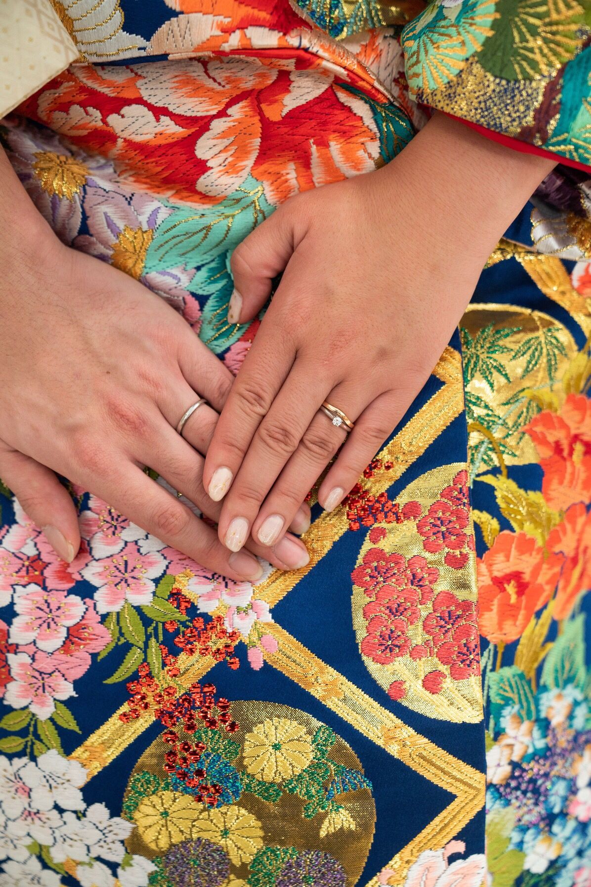 人と被りたくない私は朱色の打掛けと悩みましたが、様々な色が使われていてゴールドがとても豪華に見えるこちらの打掛けにしました。
