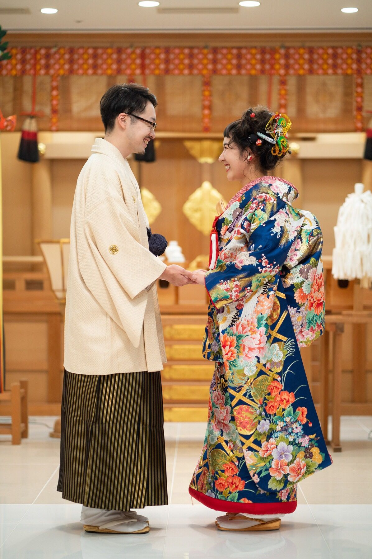 青×赤×金というド派手な組み合わせにも関わらずどこか凛としてる印象を受けたこの打掛けに心奪われました。そして、掛下も赤の絞りを選びレトロ感を出しました。