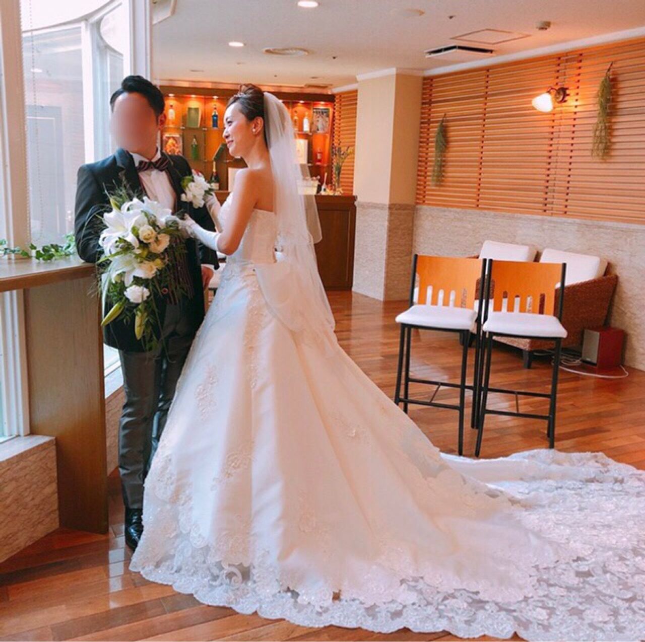 重たく見えてしまうトレーンには少し透かしがあり、胸元には可愛らしいビーズと、お花の刺繍が入っています