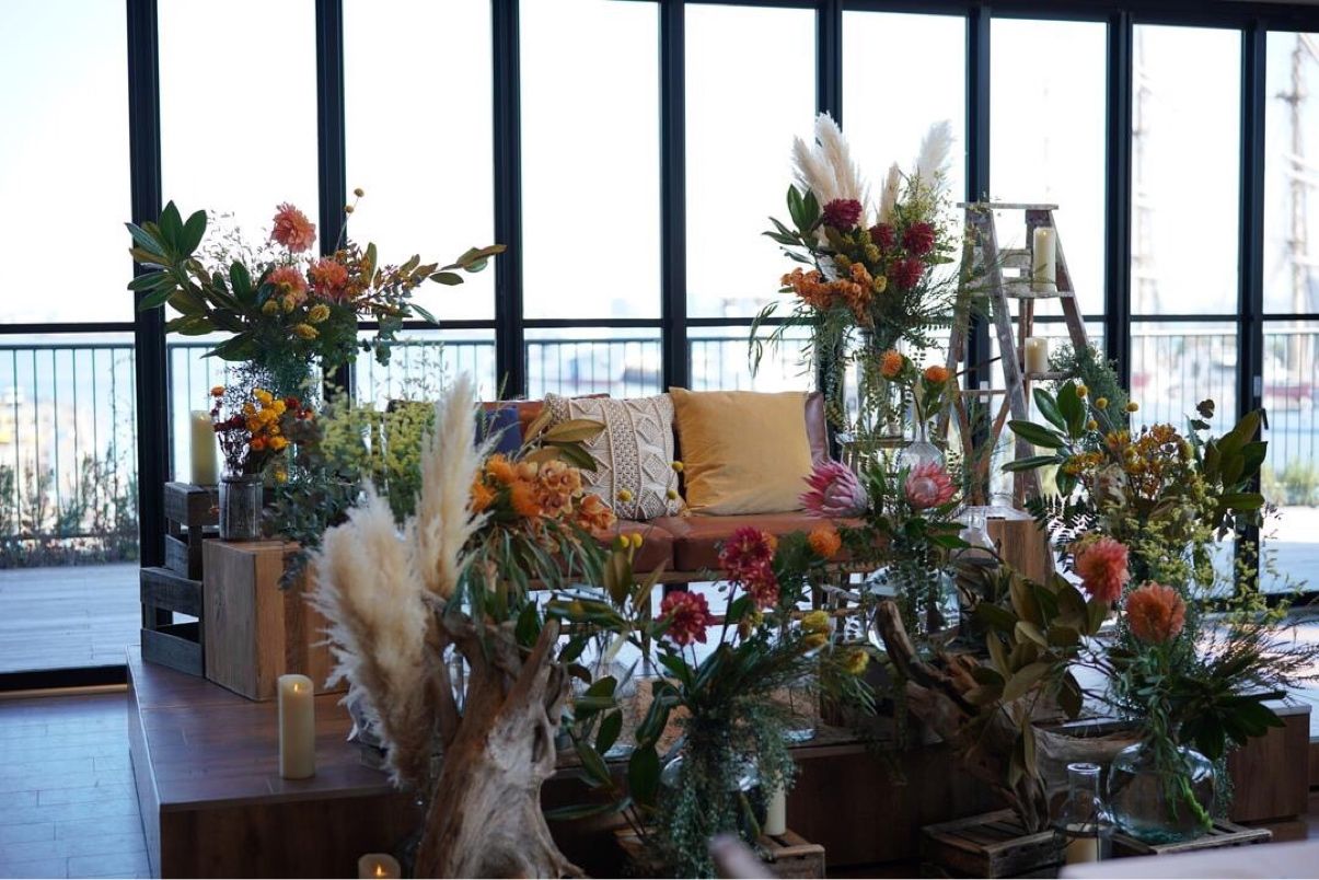 高砂はソファタイプにしたので高さが欲しいと思いパンパスグラスを入れてもらったり、黄色とオレンジの明るく温かみのあるお花を使って貰いました。流木も使って頂くようお願いもしました。
