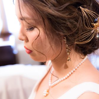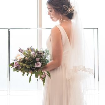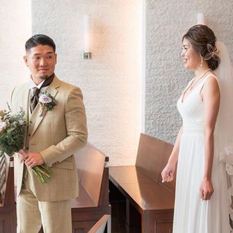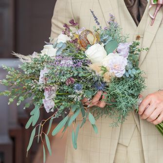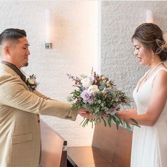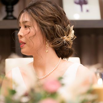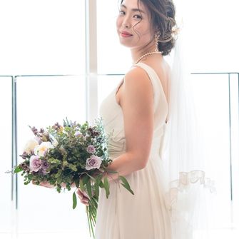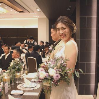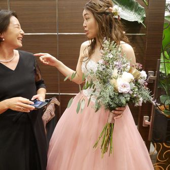 柔らかさを出す為に、パッキリとしたカラーではなく、くすみカラーで統一しました。(会場装花、ブーケ、ドレス、タキシードなど)
