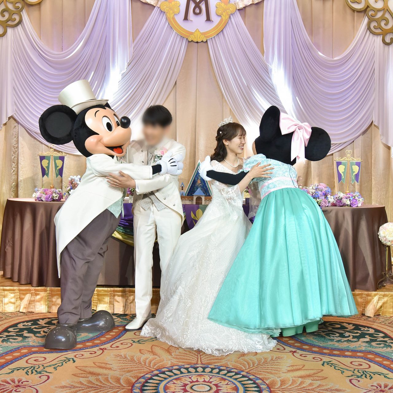 ディズニーキャラクターのみんなが私たちの晴れの日にお祝いに来てくれたことが何よりの感動でした。