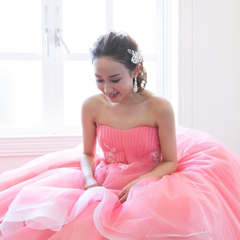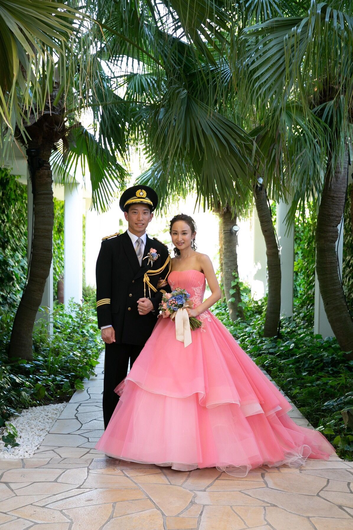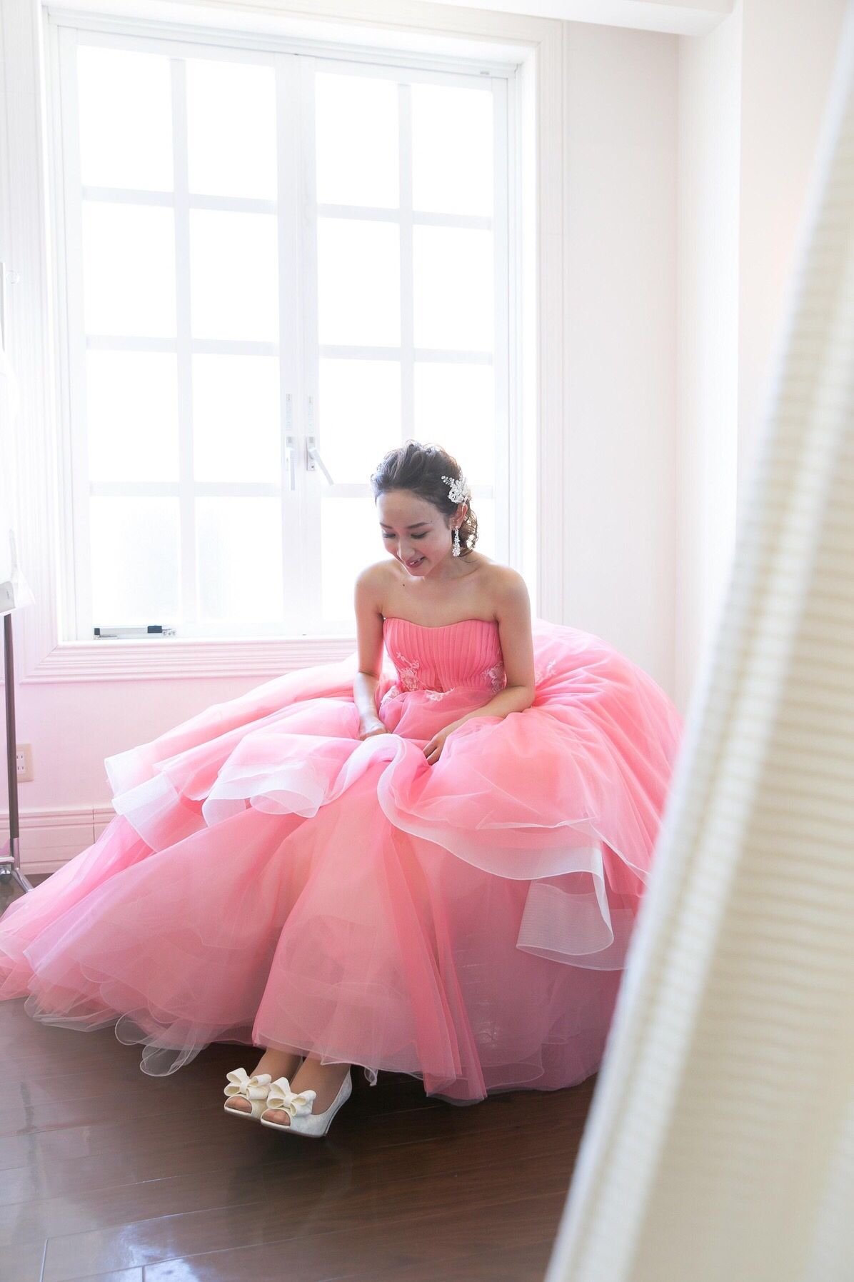 華やかなピンク色で、歩くと中のチュールが揺れて可愛いところがドレスを選ぶ決め手になりました。