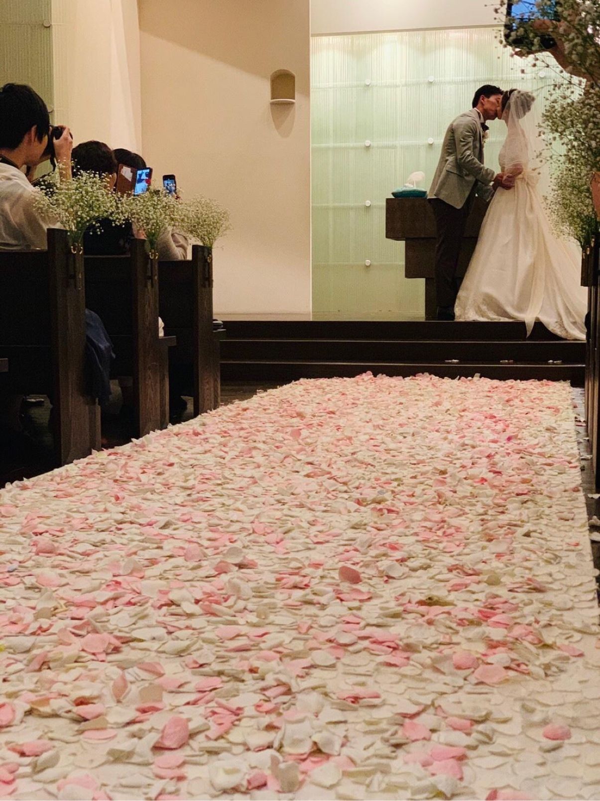 バージンロードには、ピンクと白の花びらを敷きました。真っ白な空間にピンクが映えて大満足でした!