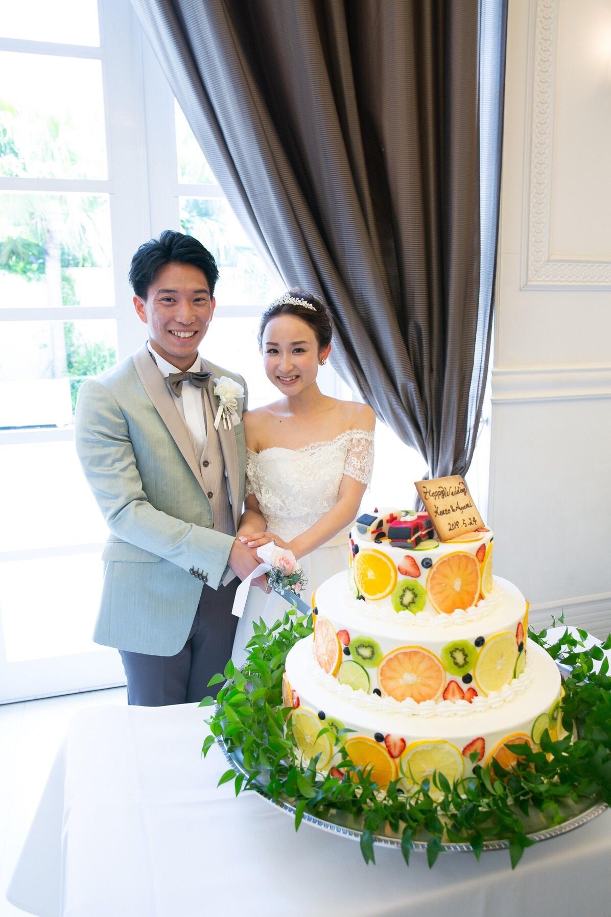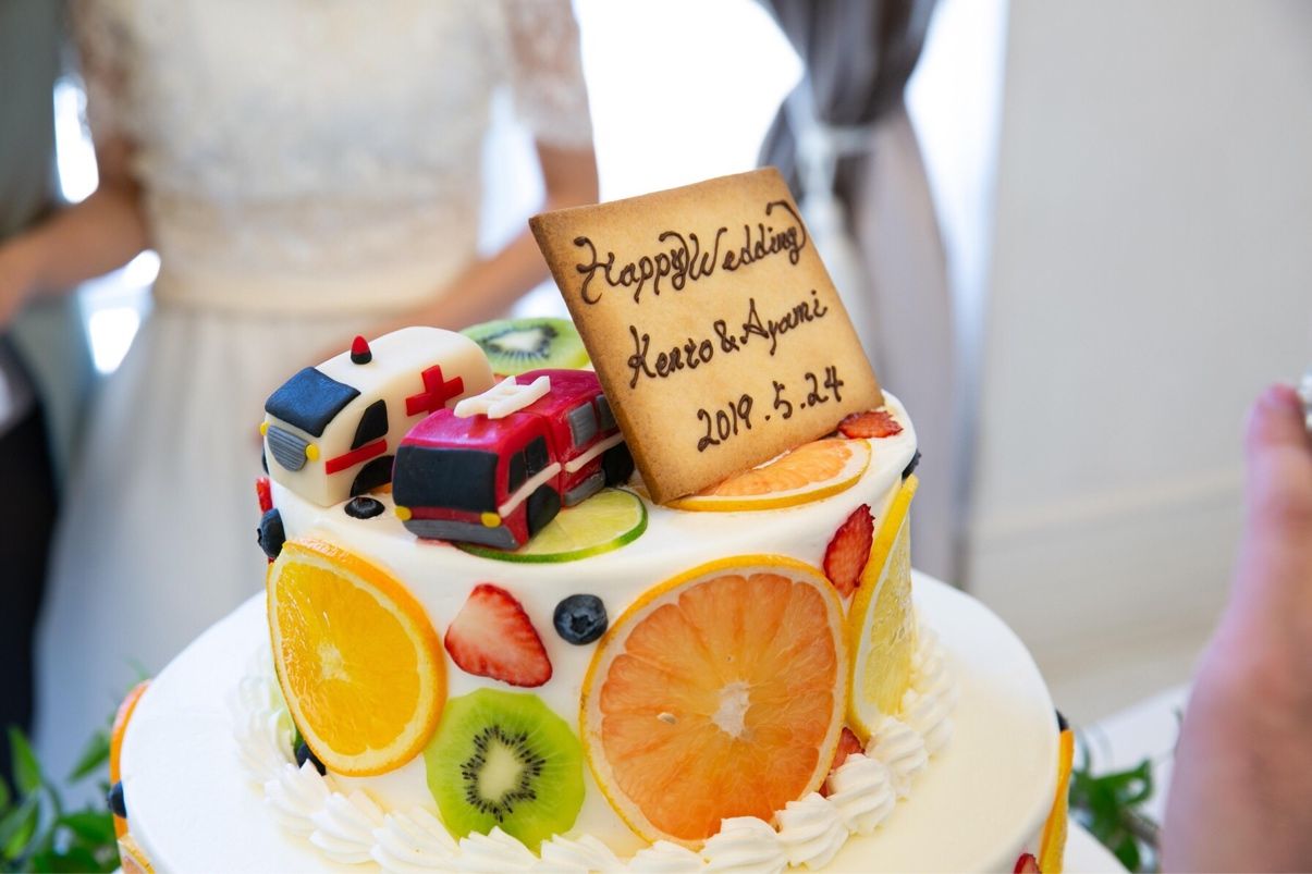 輪切りの果物をケーキ全体に散らし、夫の職業である“消防士”に合わせて、ケーキの最上段に消防車と救急車を乗せてもらいました。