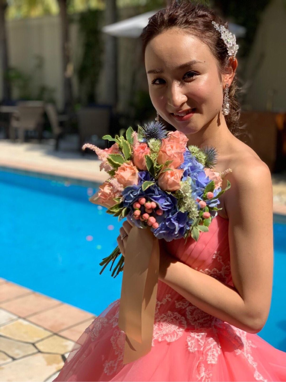 1着目には白のカラーとバラを、2着目にはサーモンピンクのバラと青いアジサイにグリーンが入ったブーケを合わせました。
