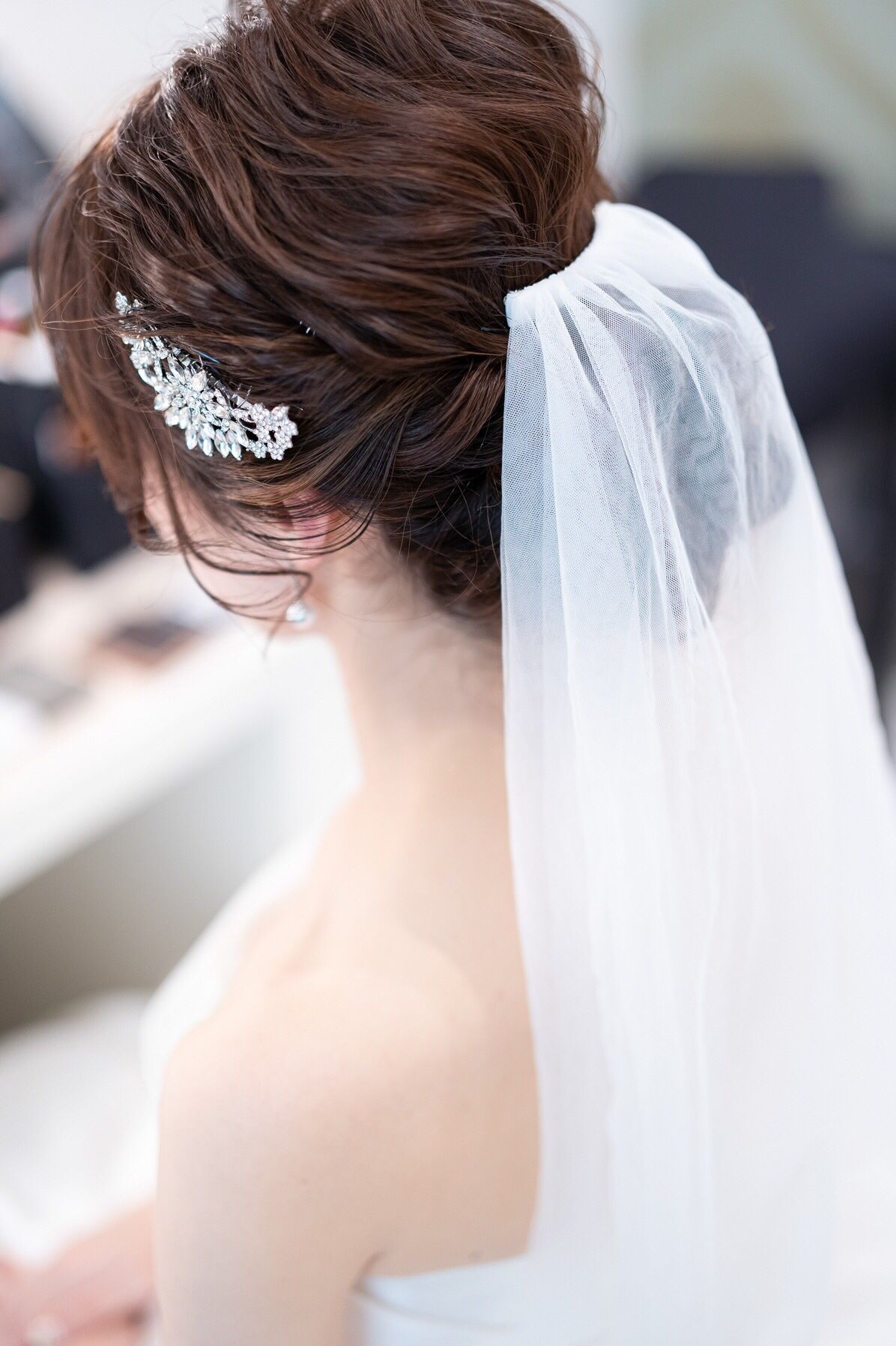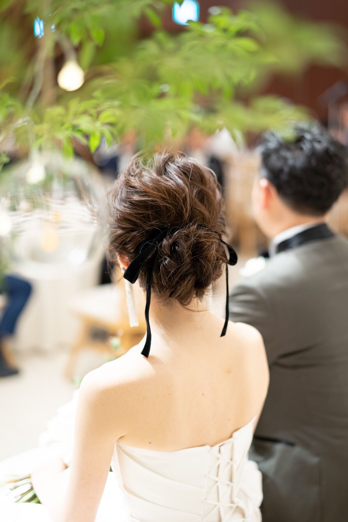 挙式時は低めのシニヨンにビジューのヘッドパーツ→披露宴ではベロアリボンをつけました。メイクは全体的にパープルの下地をつかってもらいチークを青みピンクにしてもらい透明感を意識してもらいました。