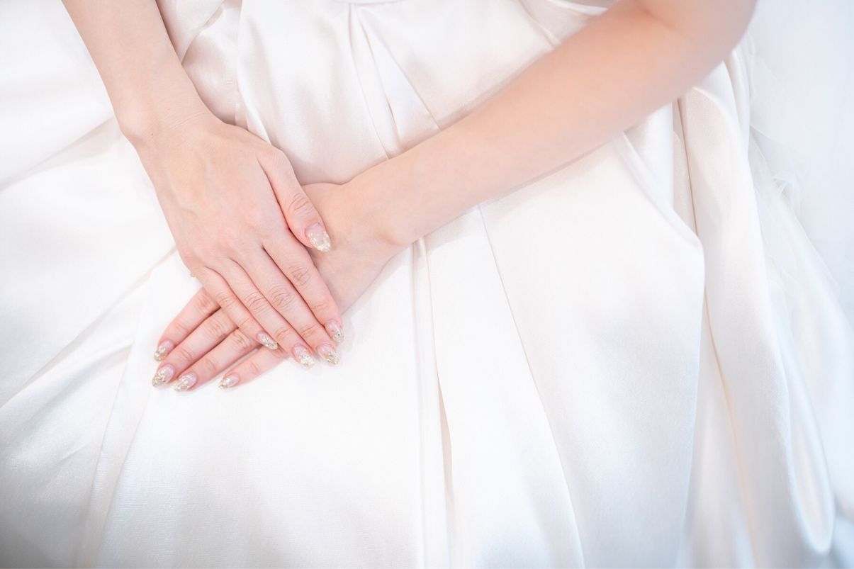 王道の白フレンチなどとも迷いましたがカラードレスの時アクセサリーをゴールドにするつもりだったのでそれにもあうようにとおもって、ゴールドのラメを混ぜてもらいました。 そのあとハネムーンにも行く予定だったので根元はクリアにしてもらいました。