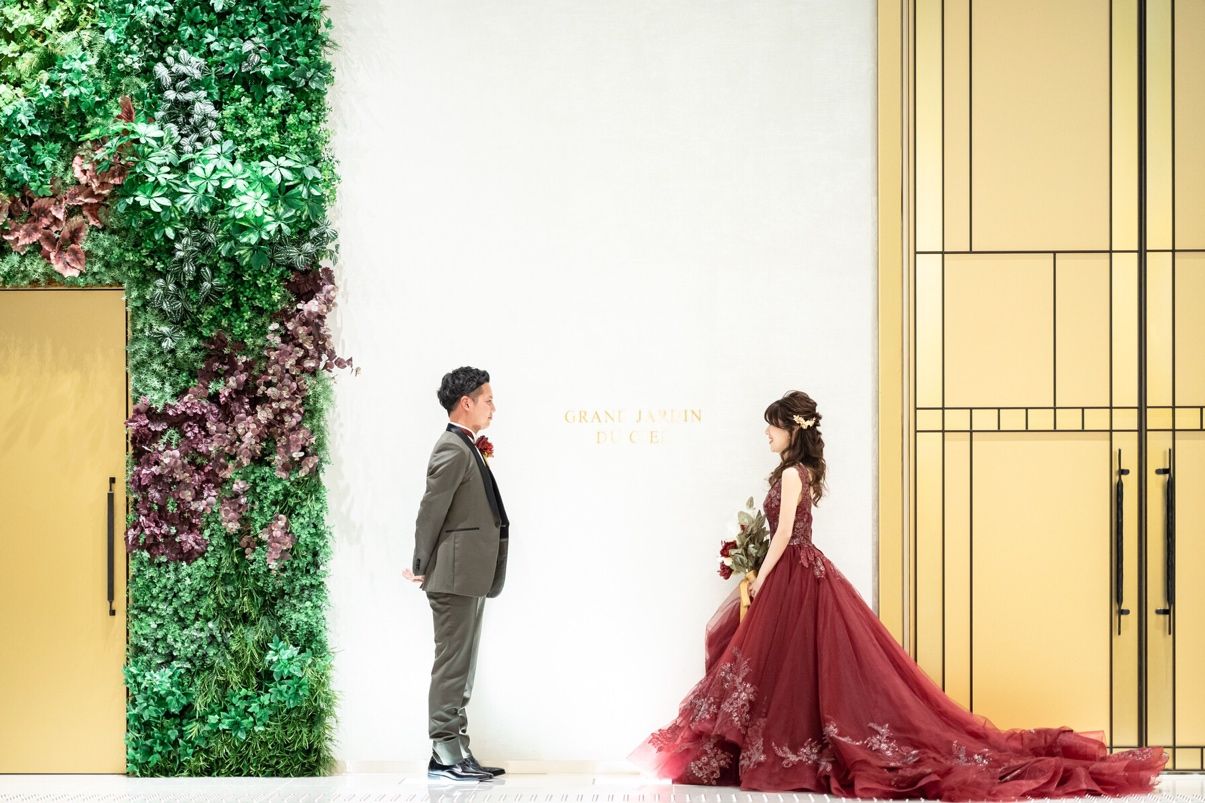 スライドウォールはあまり見たことのない演出でした。意外とゲストも驚いてくれたので嬉しかったです!また私が選んだ会場はボタニカルな雰囲気の照明がとてもお気に入りです。