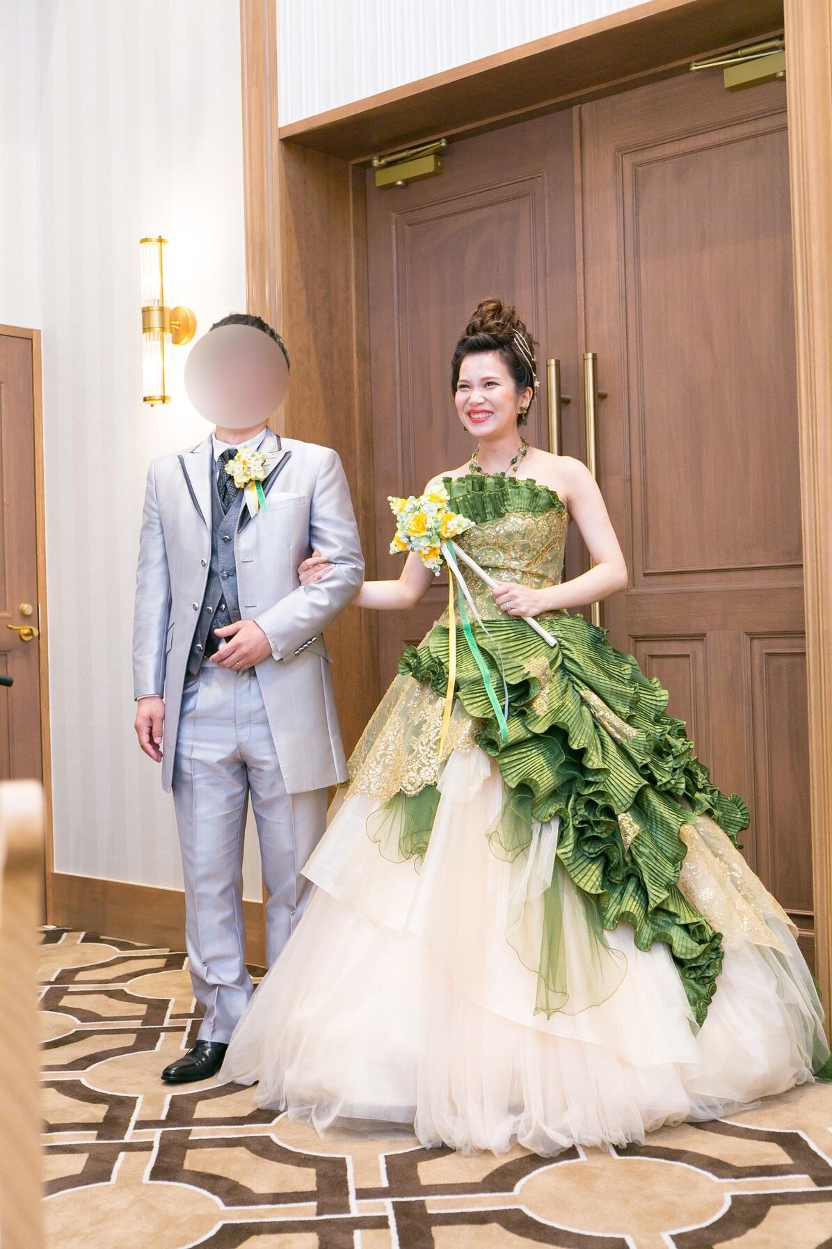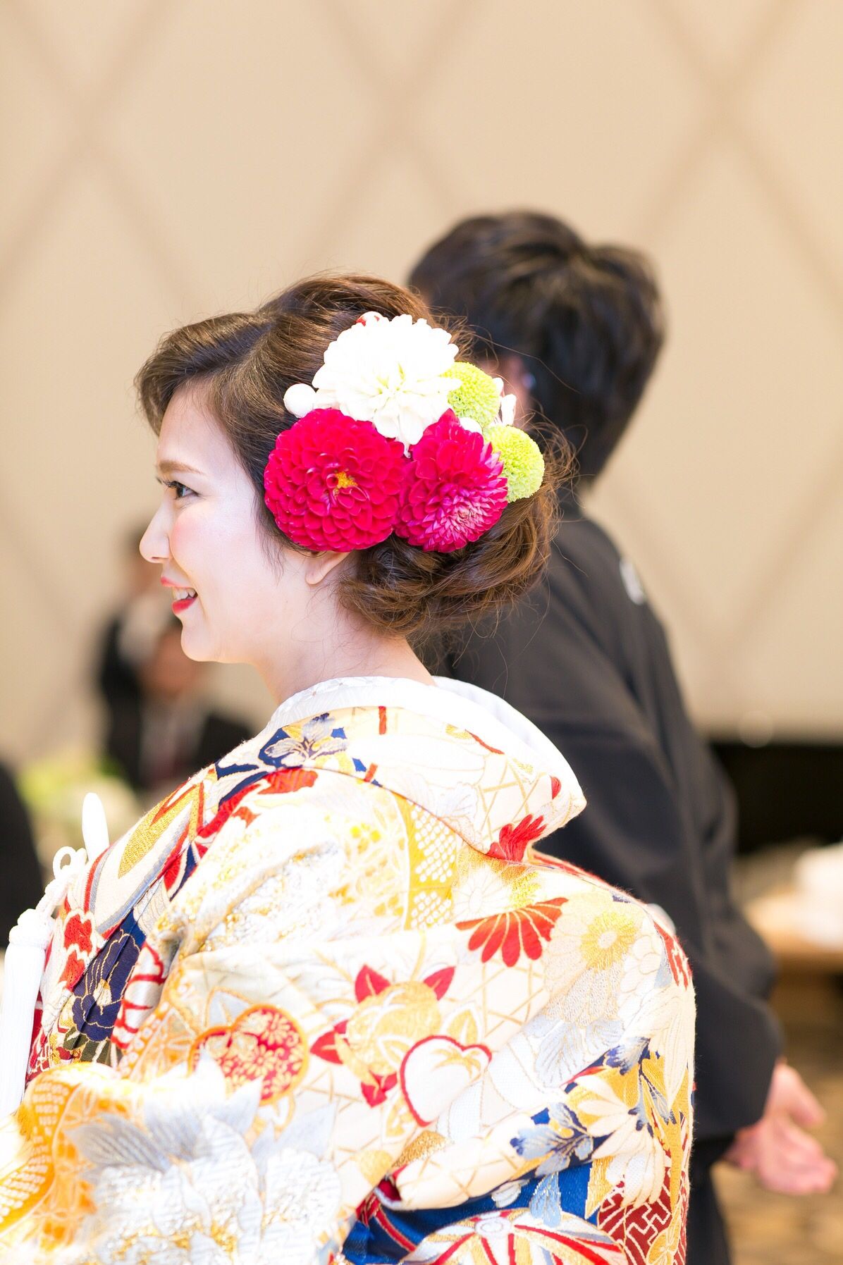 あまり見たことのない色合いで、着てみたら意外としっくりきて決めました。本当はオレンジ系のお花が付いていましたが、テーマカラーでまとめたかったので取り外してもらいました。