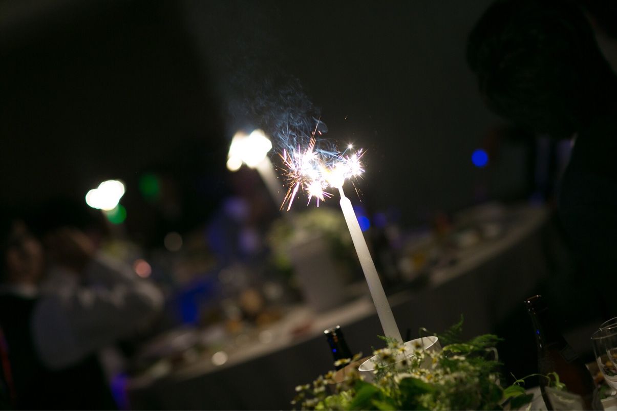 何かしらのサプライズをしたくて、カラードレスへのお色直しで、再入場の際、手に持っていた星のスティックブーケをふるとゲストテーブルのろうそくが点火する演出をしました。