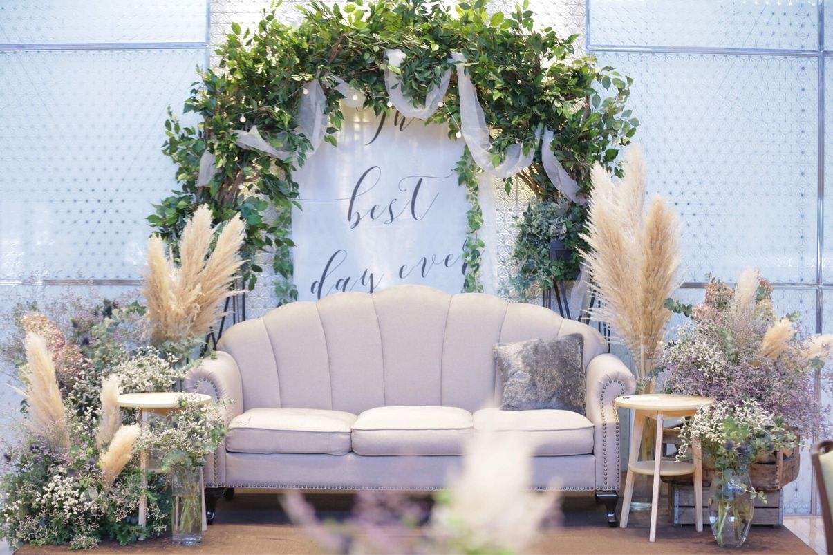 ススキ、かすみ草、グリーンベースの花を使用しました。グリーンベースにくすみ系の青や紫、白で統一しました。