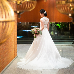 胸元と背中にレースがあしらわれていて、首元に少し高さのあるドレスです。スカートはふんわりと程よいボリュームがあって、背中はくるみボタンになっています。上品で素敵だったので、こちらに決めました。