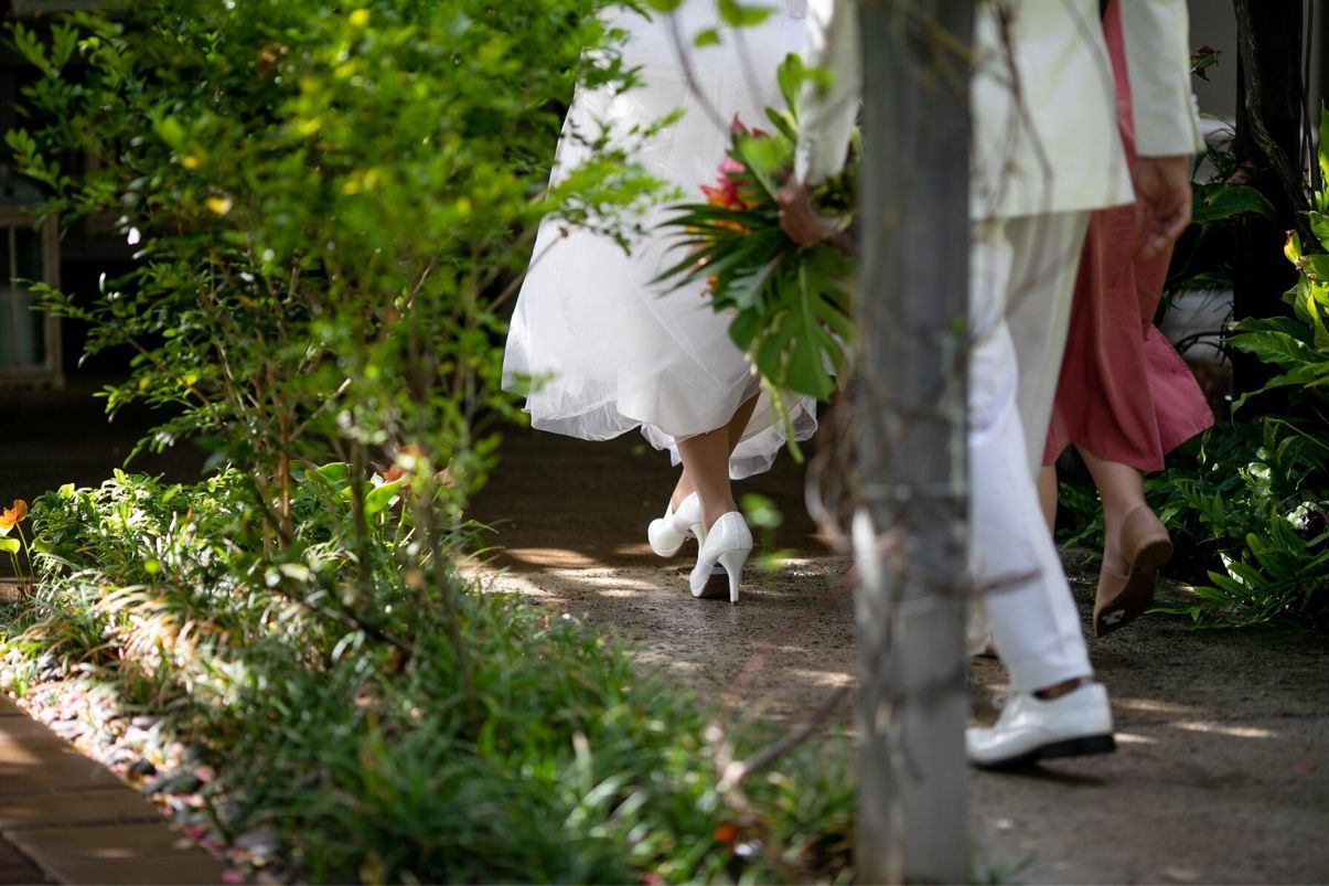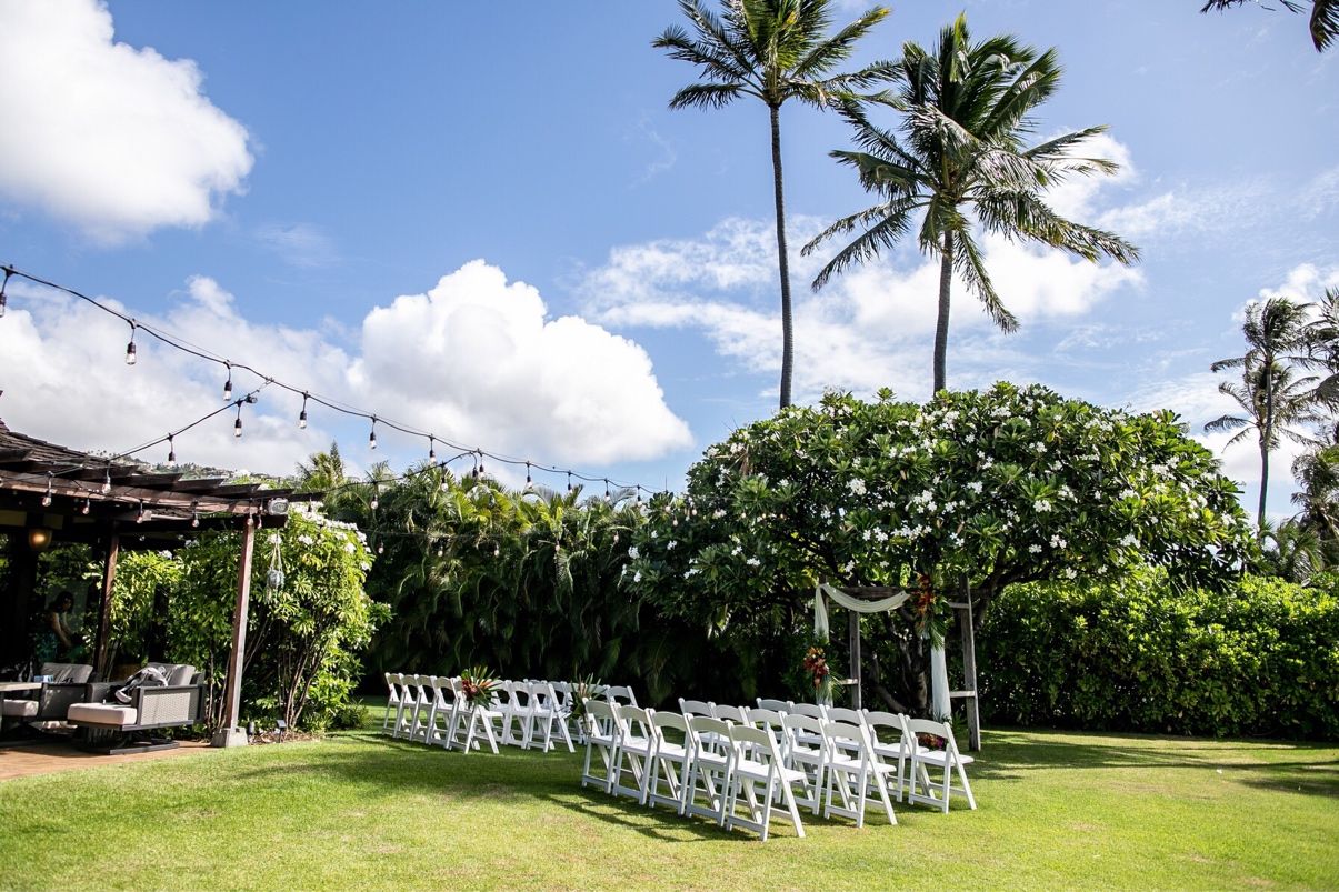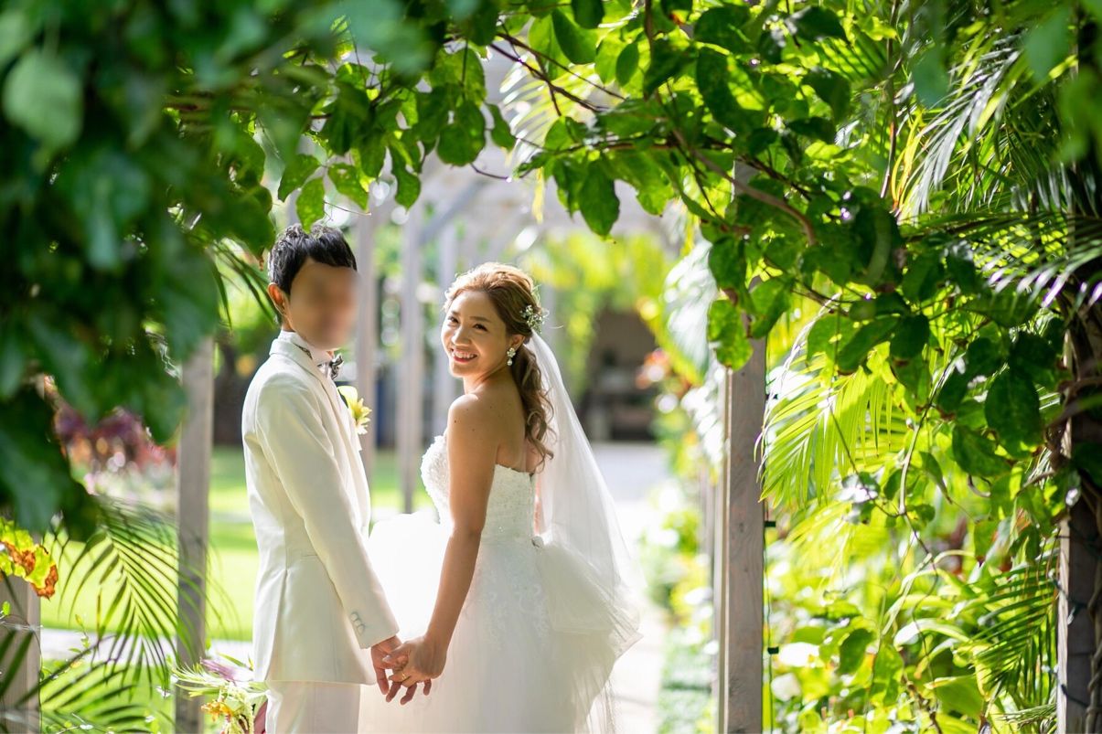 邸宅のガーデンを使った挙式になり、海に隣接された緑がいっぱいのガーデンウェディングを叶えることができました。プルメリアの木の下がメインの場所となり、自然を存分に感じることができる会場で、自然光の綺麗な写真を残せました。