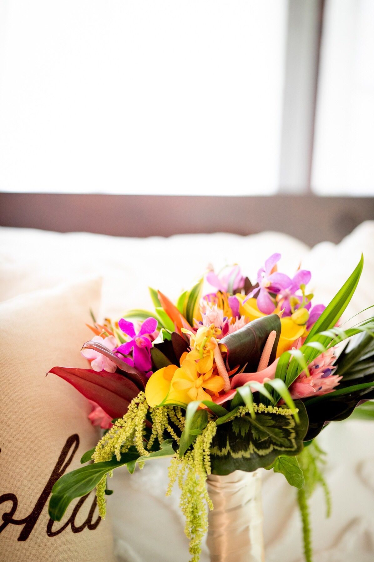 お花のオーダー内容は、ハワイらしく、パキッとした濃い明るい色のお花をたくさん使ってカラフルに、緑の大きめの葉っぱも入れてもらうようにお願いしました。