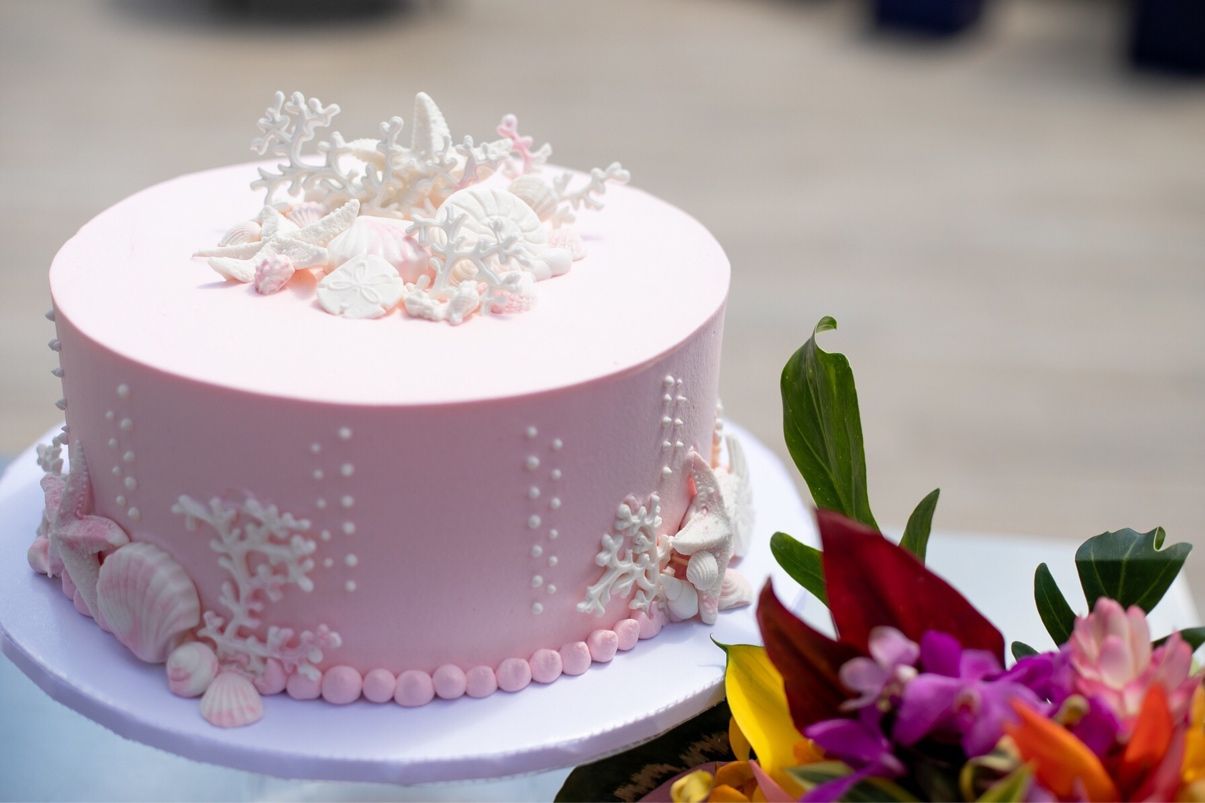 海をイメージした、ベビーピンクのウェディングケーキをオーダーしました。貝殻や砂浜が再現されていて、とてもわたしらしくて可愛いケーキと大好評でした。