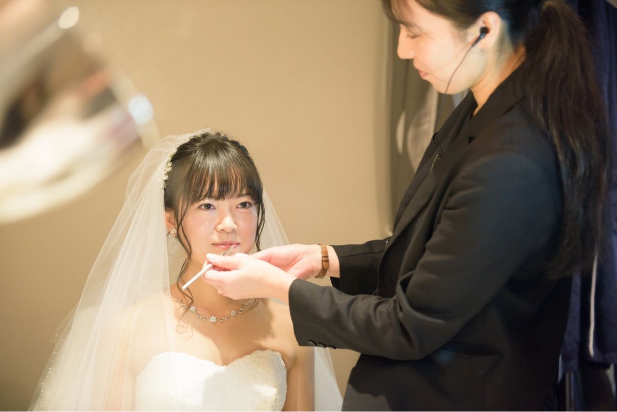 ウェディングドレスの時は大きめの白いアクセサリーを左側につけ、カラードレスには生花の花冠を合わせました。