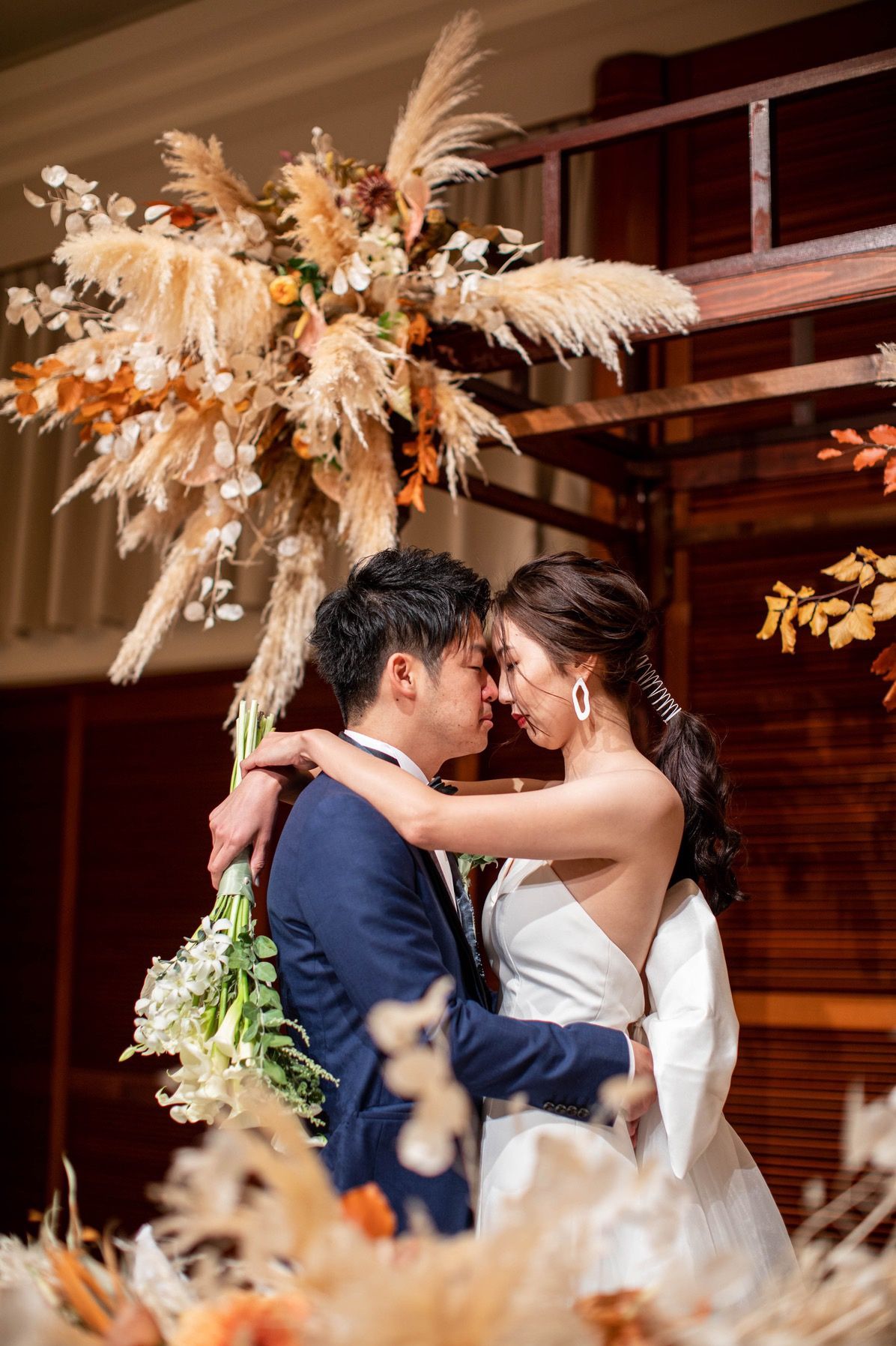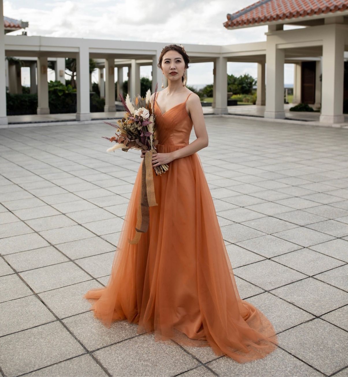 流行りのテラコッタカラーを取り入れ、テーマカラーが使われた会場装飾にベストマッチするドレスをフルオーダーしました。