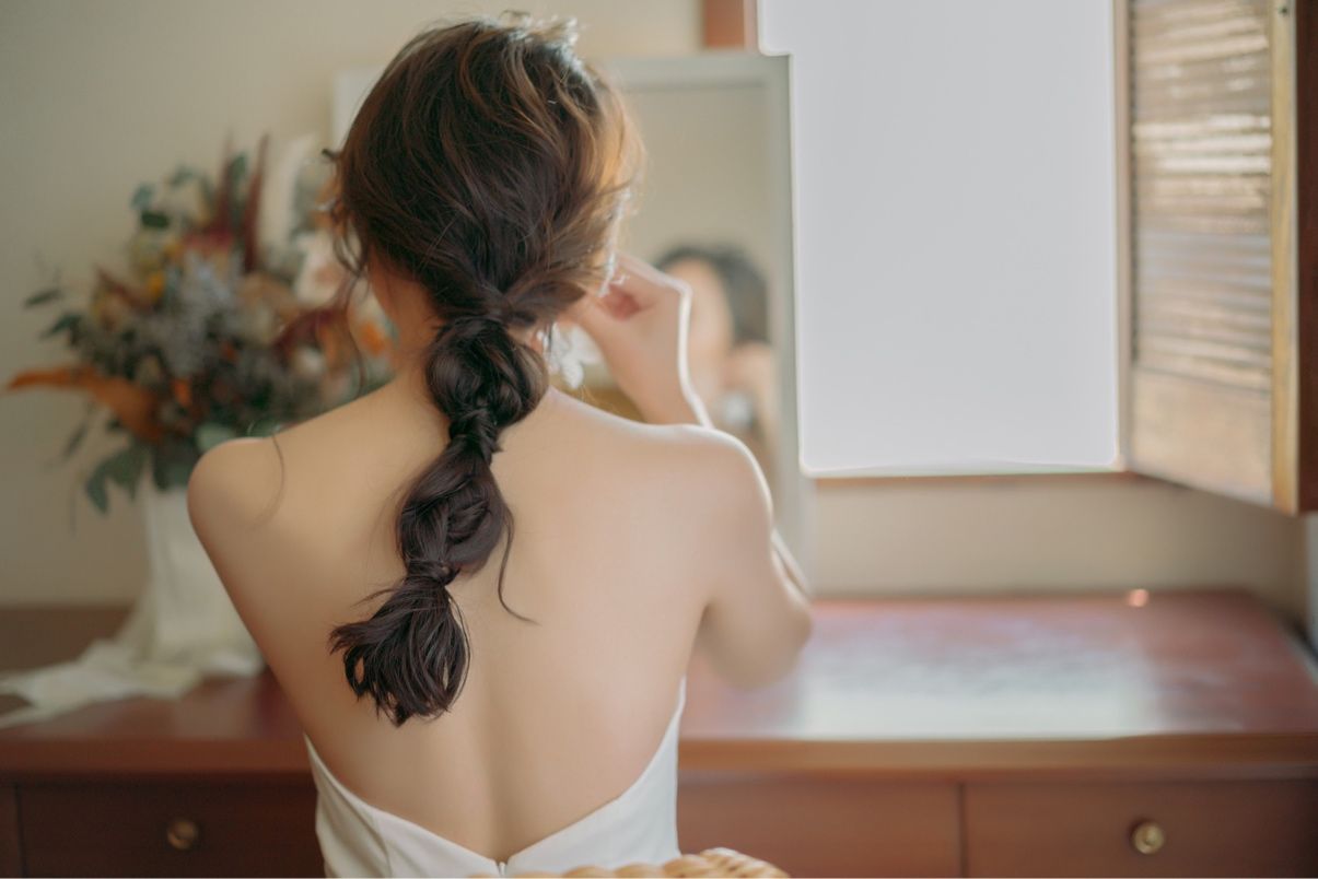前撮りの玉ねぎヘア、紐を使ったポニーテール、シンプルなまとめ髪、フィッシュボーンヘアとかえました。