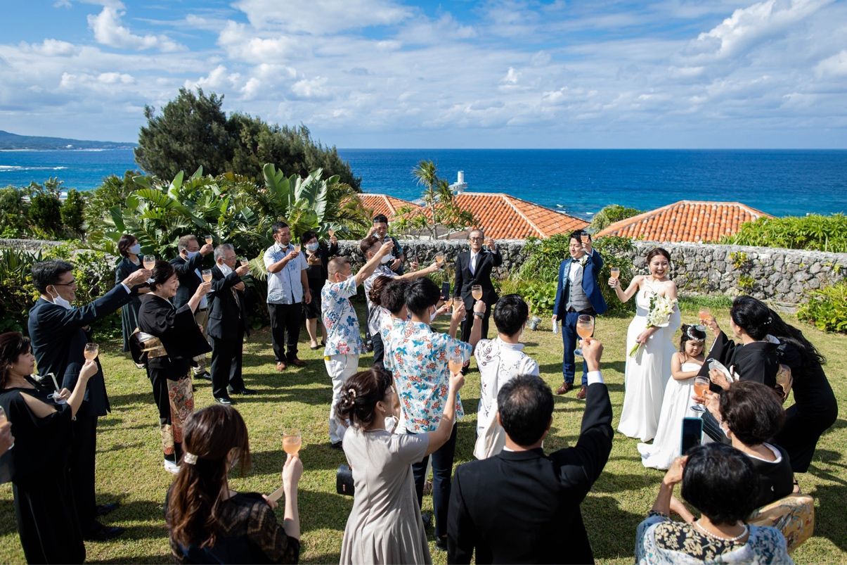 ゲストとつながりを感じるitemをみんなで一緒に作る。記念日に毎年あけるタイムカプセルや一斉開封パーソナルお手紙の演出。気軽に使えるオリジナルエコバックでゲストにギフトを渡す。沖縄の伝統芸能「エイサー」。高砂写真撮影。ガーデンでの写真撮影。
