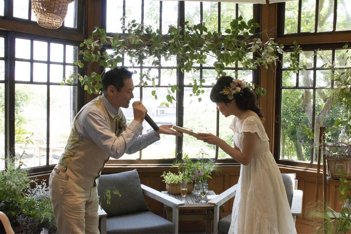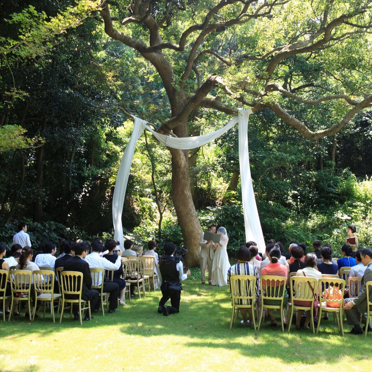 古我邸の裏山にある森のチャペルは本当に素敵です。シンボルツリーに布を垂らしたシンプルな装飾だけでも緑に囲まれた空間はとても絵になり、リラックスして挙式が挙げられました。