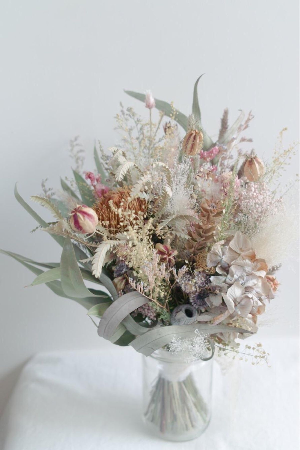 挙式では、同じ古我邸で挙式された卒花嫁さんからお譲りいただいた繊細な手作りヘアアクセサリーをつけたくて、それに合うようにアレンジしていただき、ローポニーはオーダーしたブーケとお揃いのドライフラワーのヘッドパーツをつけました。