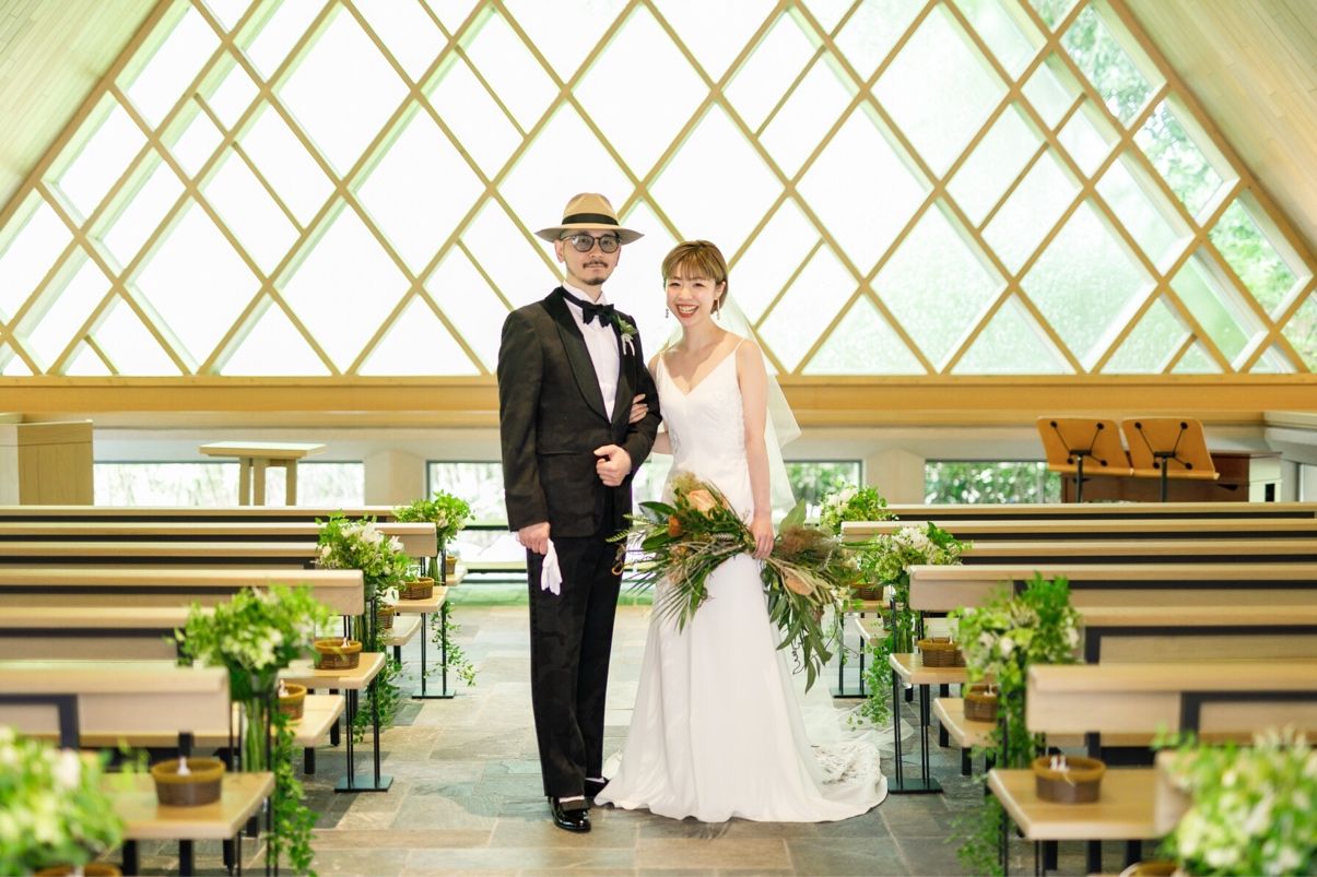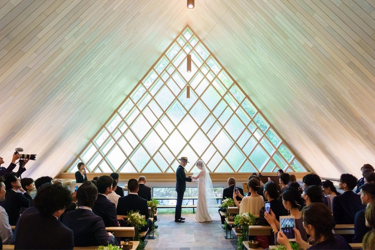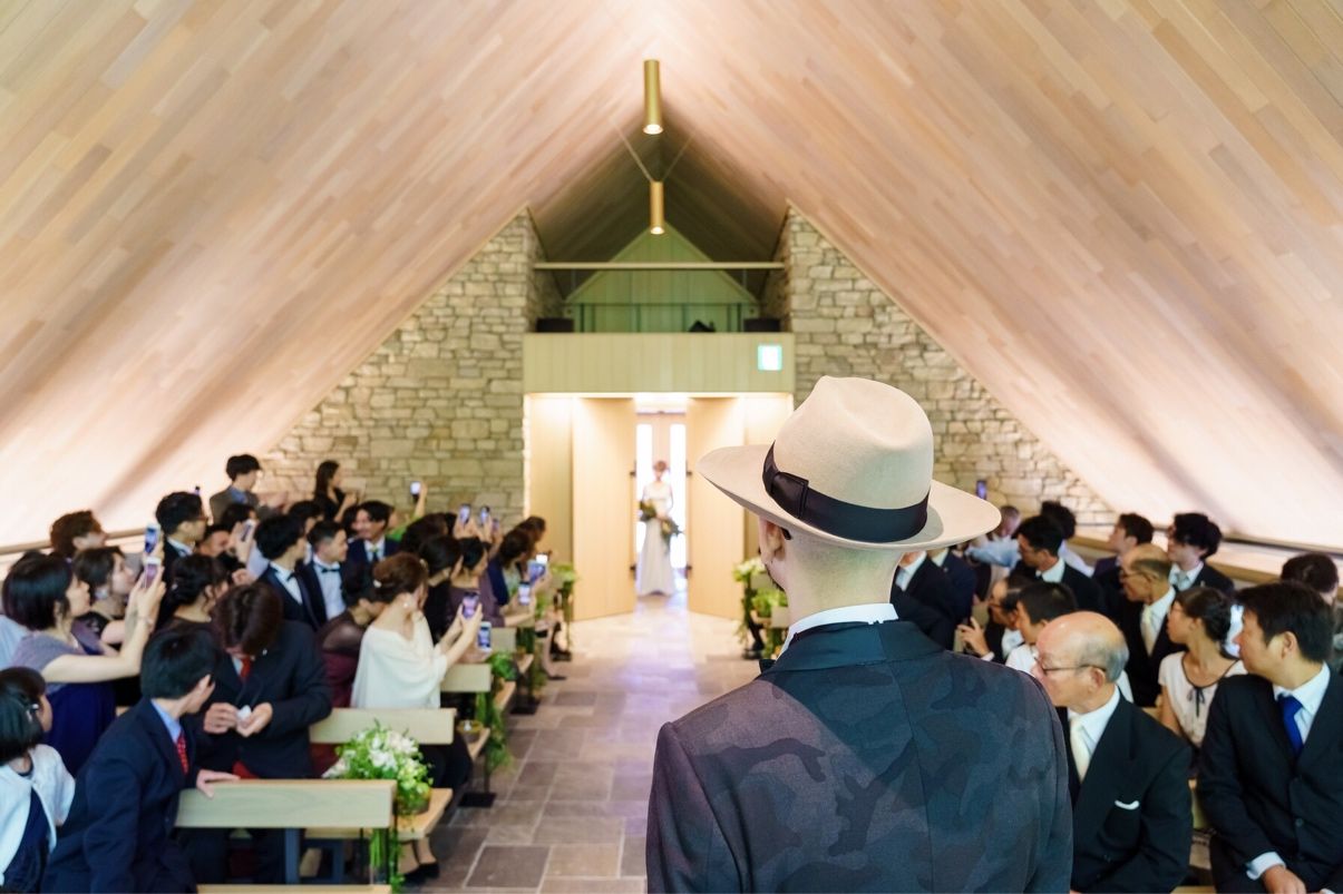 ウッド調の造りで、バージンロードを進むごとに天井が高く広がっていて「ふたりと家族を明るい未来へ導く」という想いが込められて設計されたそうです。