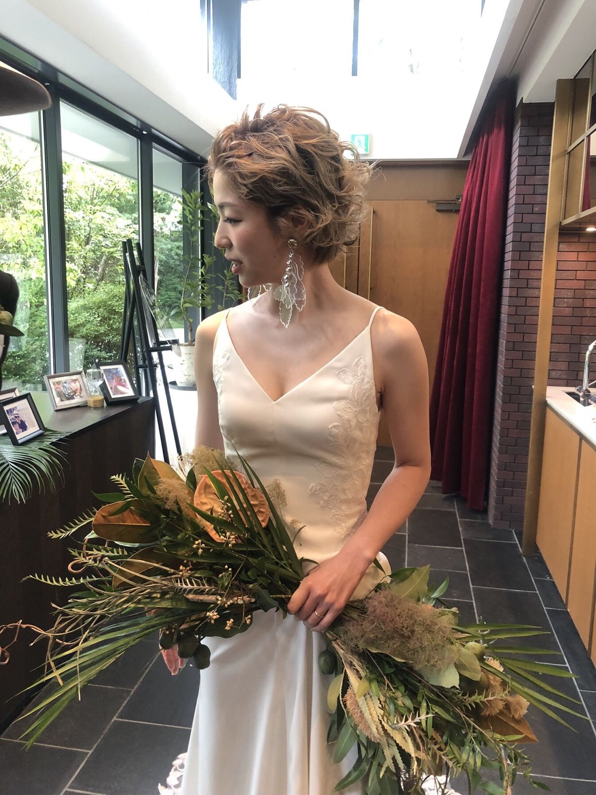 お花の色味はいらないので、色んな葉っぱ系のグリーン多めでボタニカルで、個性的にしたいので、変わったグリーンを入れて欲しいとお願いしました!