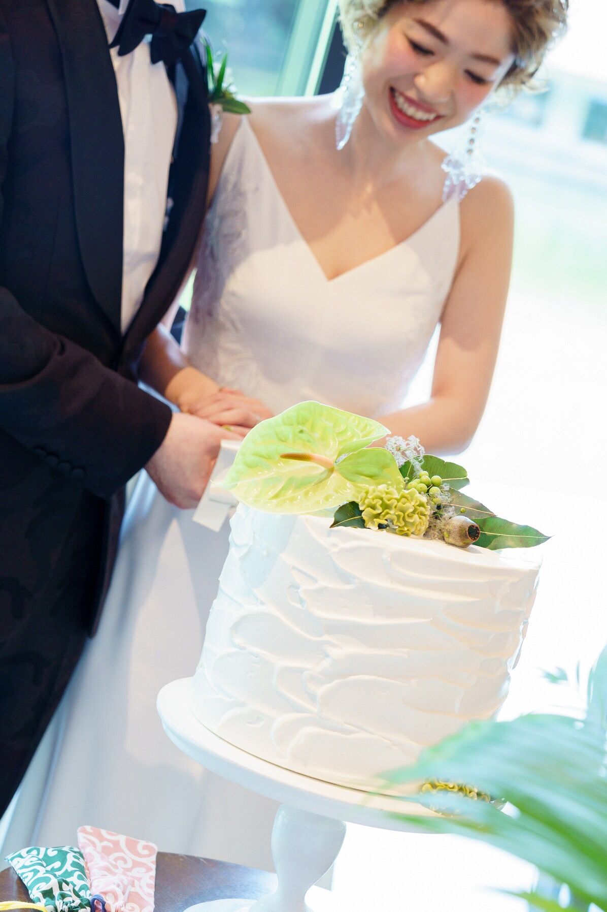本当は真っ白の生クリームに、シンプルに金箔でとイメージしていたのですが、金箔がすごくいいお値段だったので、生クリーム1段で会場の装花に合わせてもらいました!