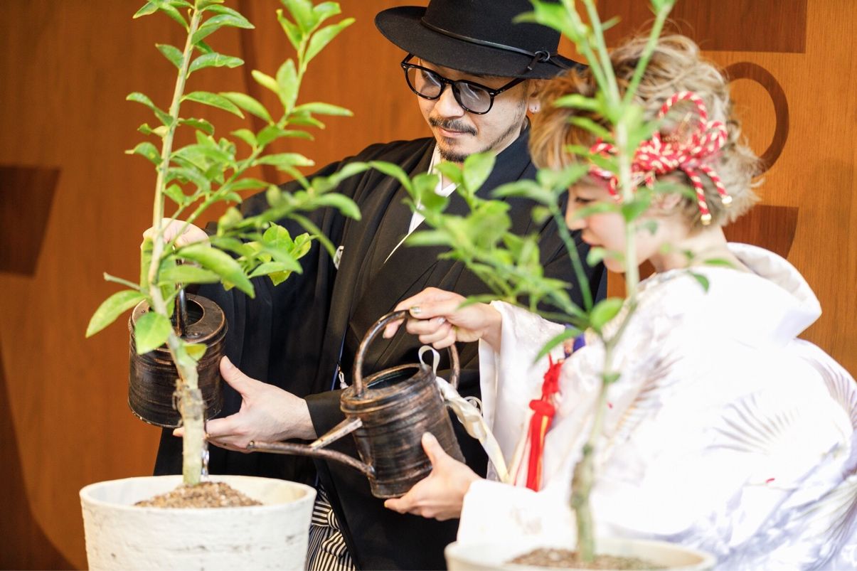 ウェルカムスペースでゲストの皆様に土を入れていただき、両親に手紙を読んだ後、お互いの地元の水を用意し、かけ合せ、お互いの両親にプレゼントしました。お互いの地元の気候に適したレモンの木をえらびました。