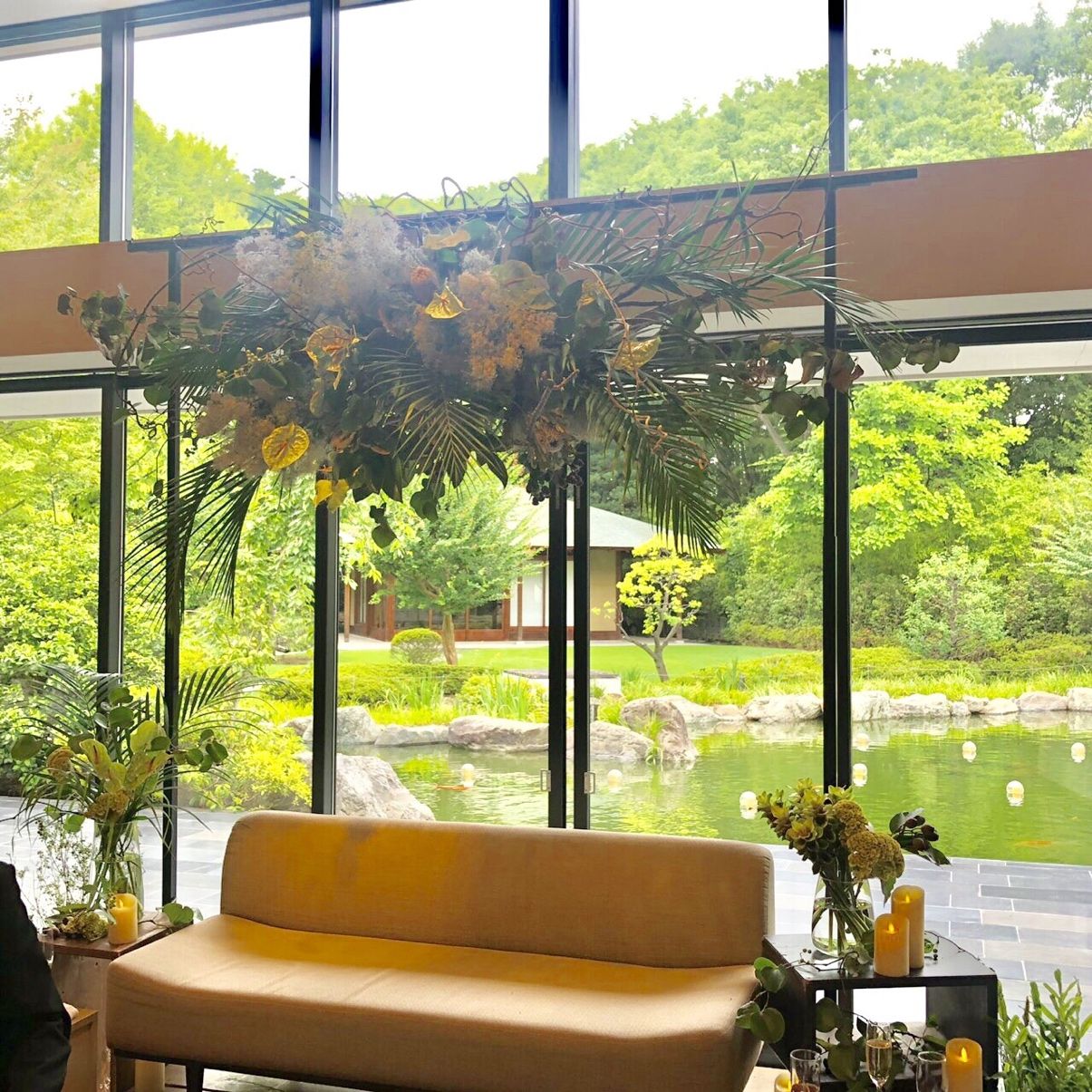 各卓もキャンドルなどはやめ、クリアガラスの花瓶や、テーブル平置きでアレカヤシを飾りボタニカルさが出せました。高砂も背景が庭園でよかったので、両サイドボリューム少なく、上にアーチ状に飾っていただきました。