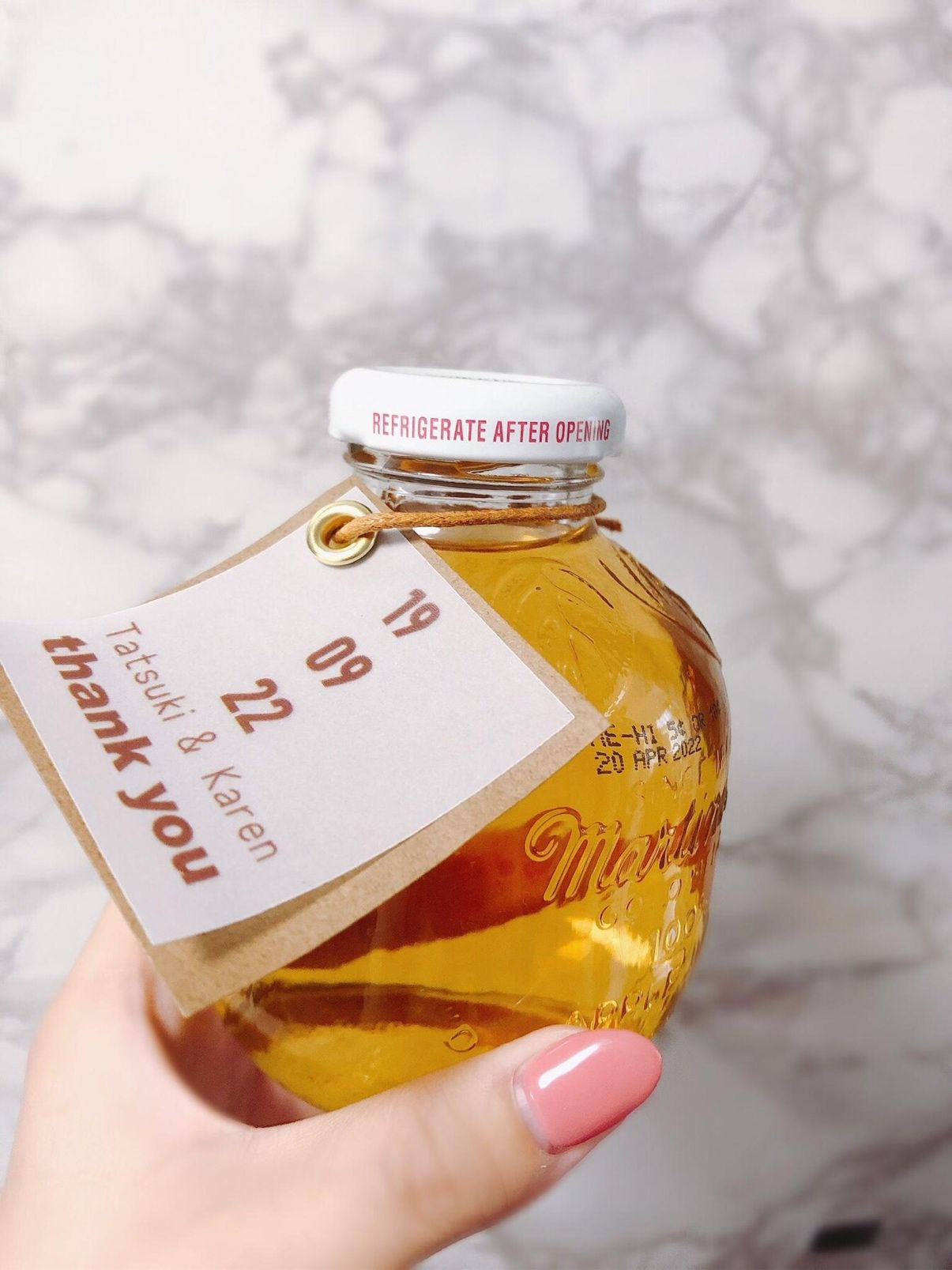アップルジュースに、手作りのサンキュータグをつけてあげました!