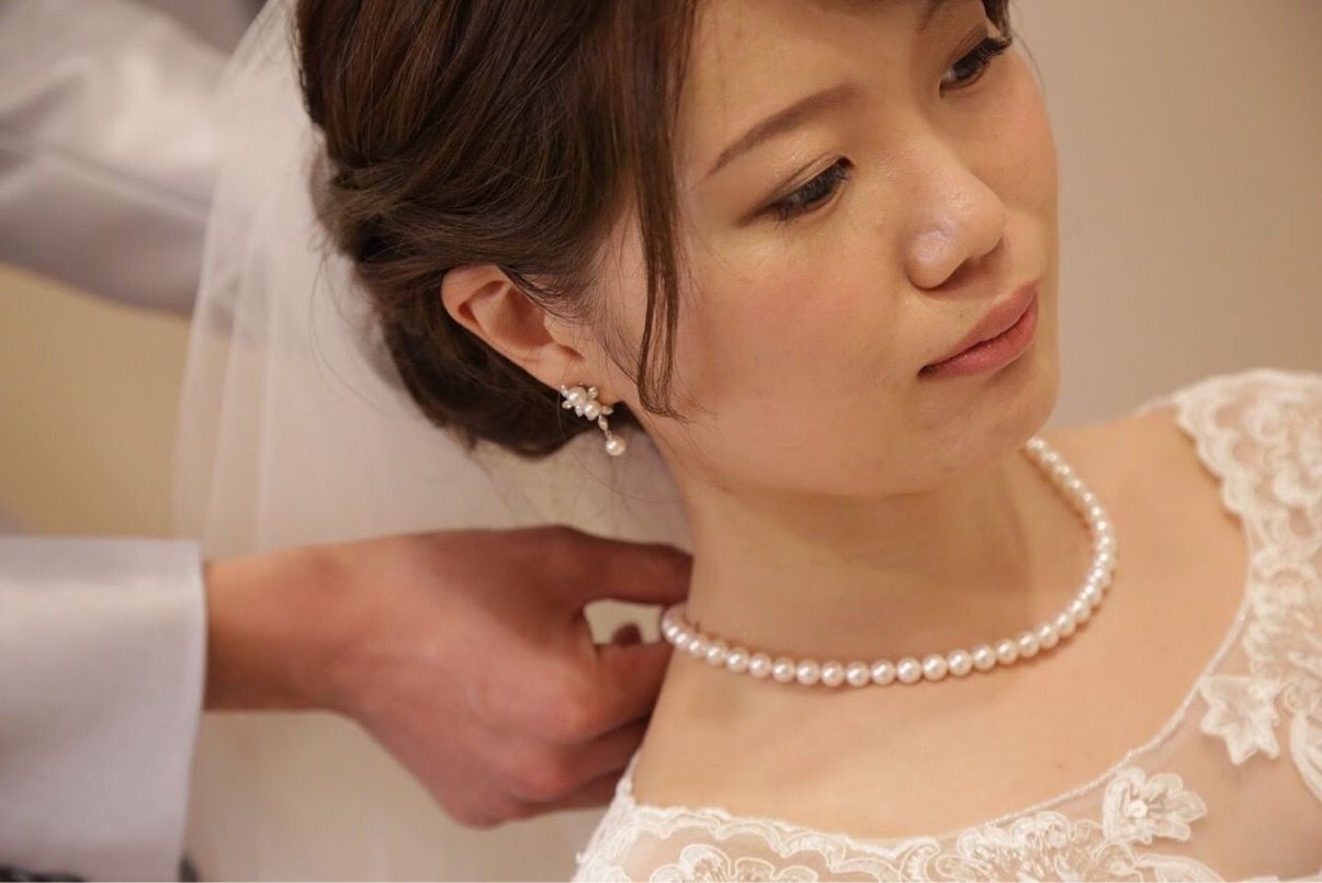 WDでは、MIKIMOTOのティアラをレンタルし、自前の本真珠のネックレスを着用しました。 CDの際は、アーティフィシャルフラワーでオーダーしたヘッドパーツと、ハンドメイド作家さんから購入した花びらとビジューのピアスをつけました。