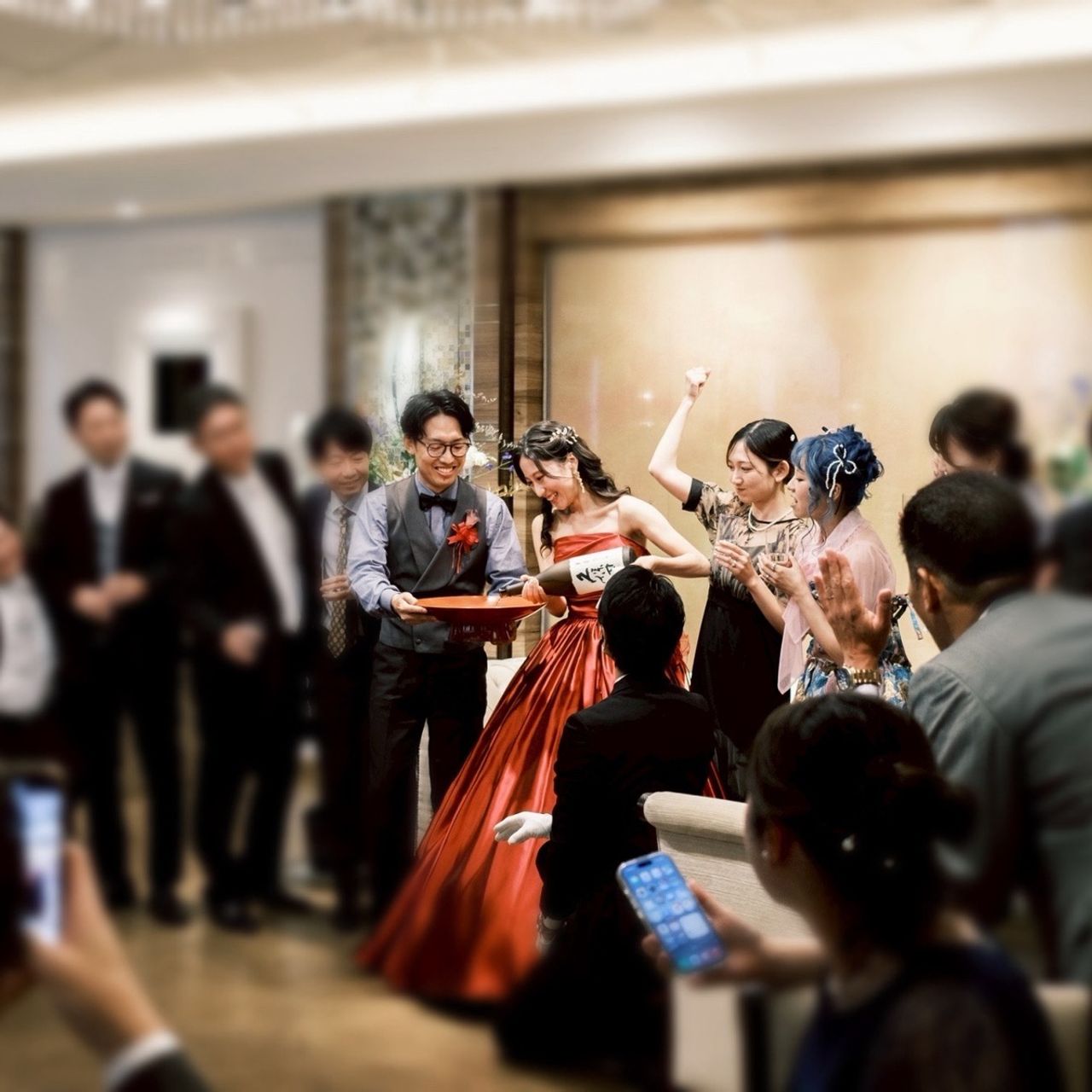 「one more cheers」の際に、夫だけ盃だったので、そこに日本酒を注ぐパフォーマンスをしました。