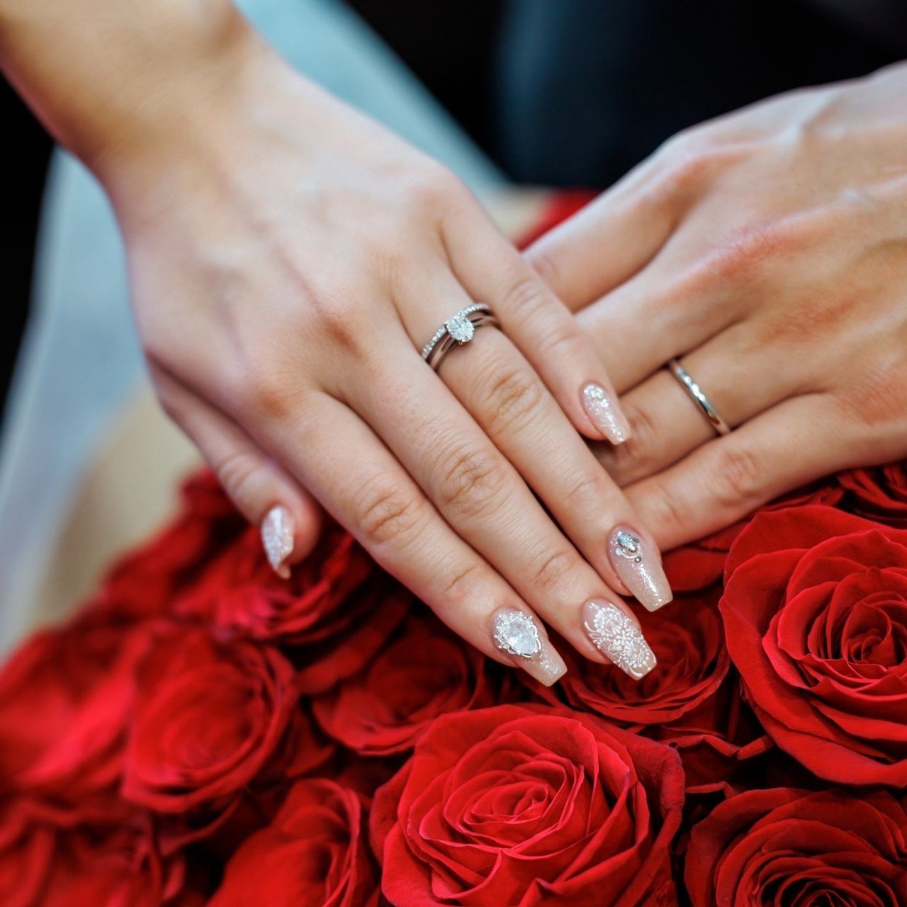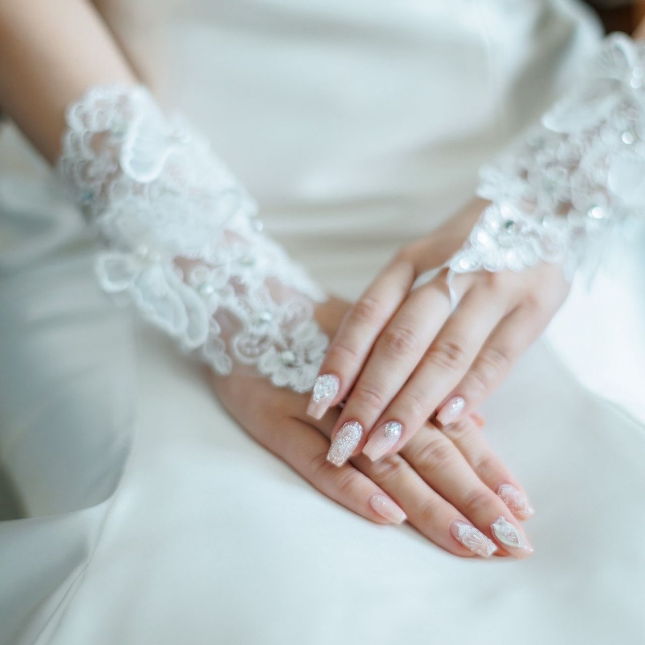 ピンクベージュで素の色味に近い下地の上に、白でレースデザインを描いたネイルです。指輪に合わせてシルバーやクリスタルのパーツを付けました。
