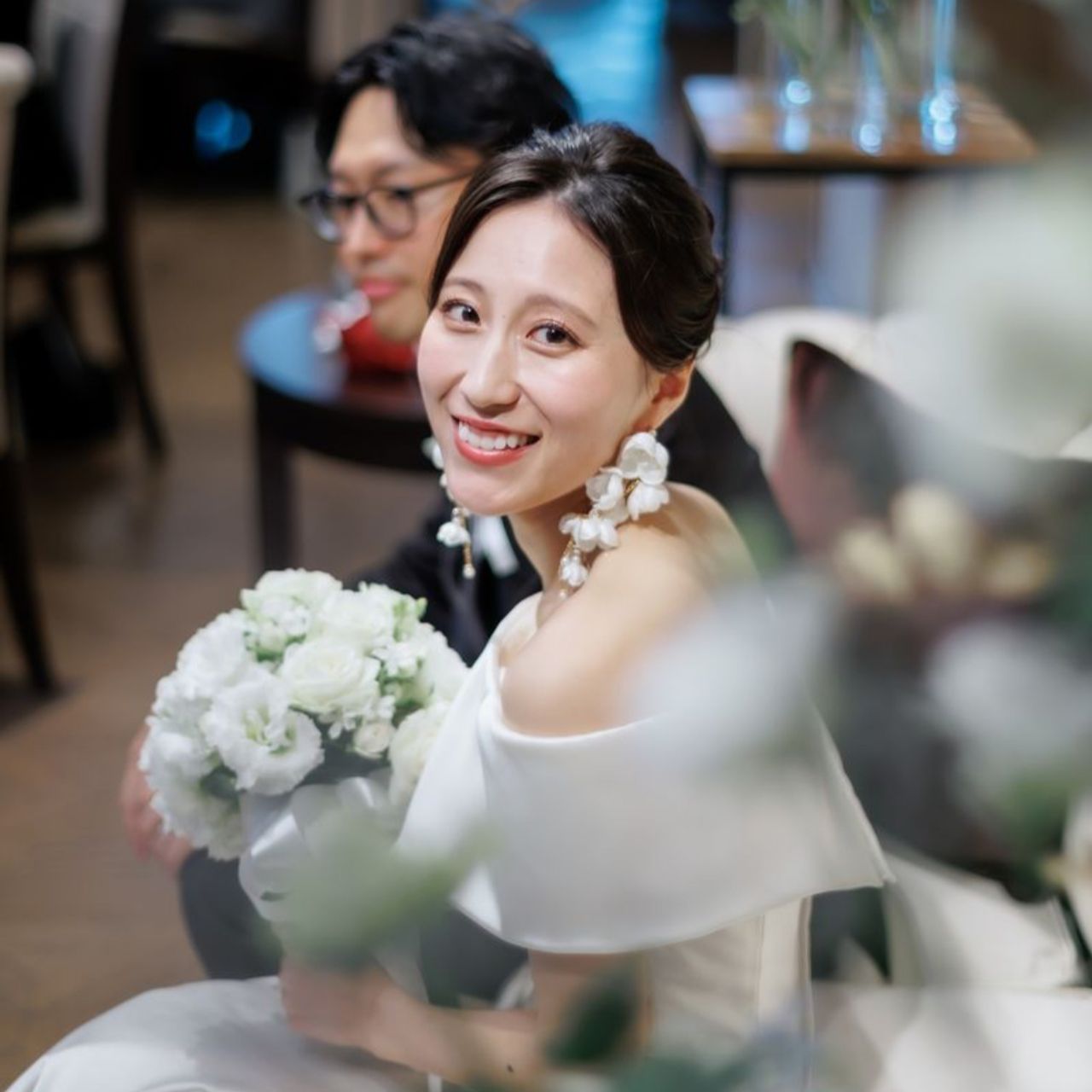 挙式はバタフライモチーフのピアス、披露宴では白い花がついた大きめのピアス、お色直しではゴールドピアスをつけました。シンプルにしたかったので、ネックレスなどはつけていません。