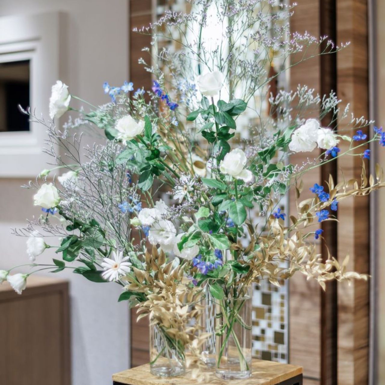 白とブルーをメインに、ところどころゴールドの葉っぱを使っています。