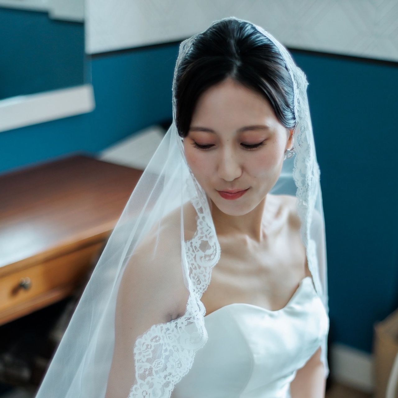 挙式ではレースのマリアベール、お色直しではゴールドのヘアコームをつけました。