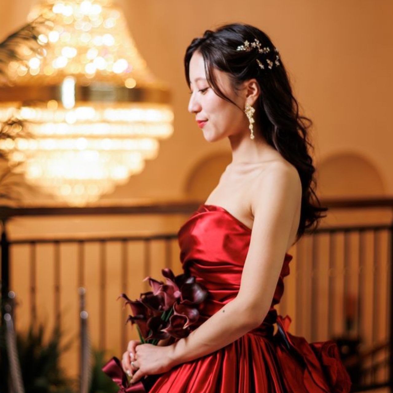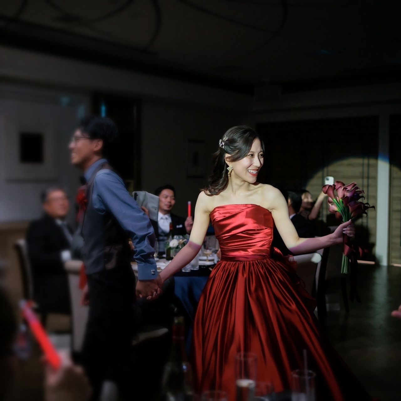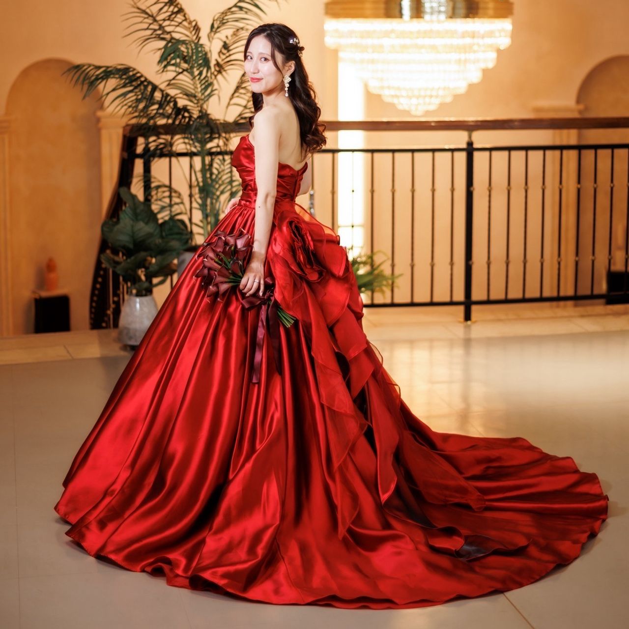 他の赤いドレスも着ましたが、ボルドーやレースの赤と違い、光沢感のあるはっきりとした赤色がとても綺麗だったため、こちらを選びました。