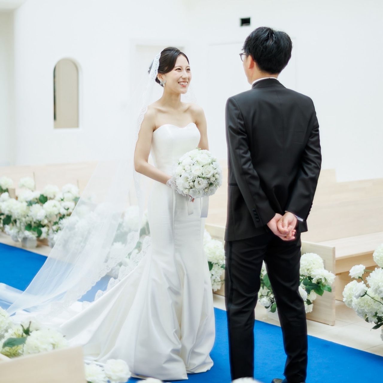 ここのチャペルは天井が高く、ステンドグラスや青いバージンロードが綺麗で、入っただけで圧倒される雰囲気が理想的でした。バージンロードの先には階段があり、ドレスのトレーンが綺麗に見える点も良かったです。