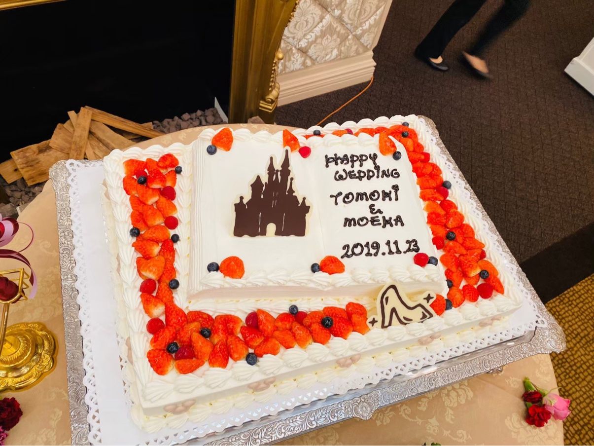 ディズニーといえば「むかしむかし…」から始まるイメージなので、ブック型にしようと決めていました。文字はディズニーフォントにしてもらい、2人の思い出のシンデレラ城とガラスの靴を置いてもらいました。周りはベリー系で大人っぽい色味にしました。